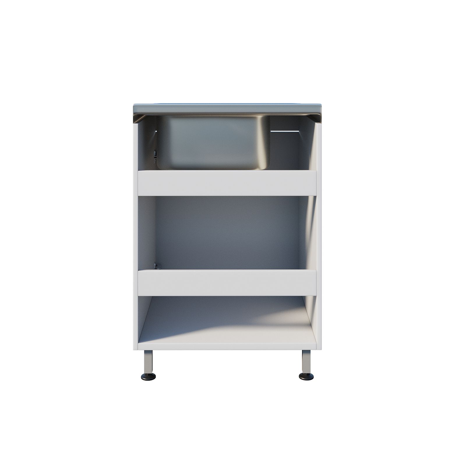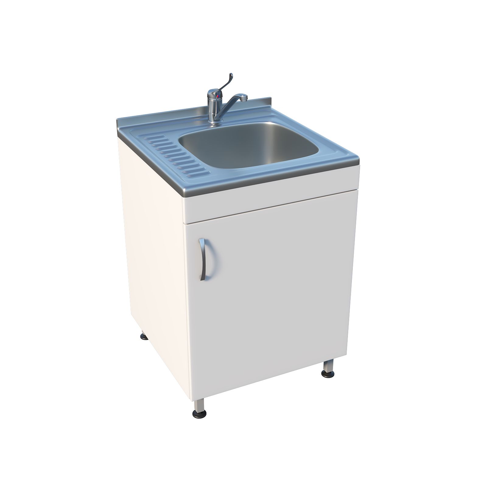 Мойка оснащена тумбой под мойкой с распашной дверцей, что обеспечивает удобный доступ к хранимым материалам. Регулируемые по высоте ножки с винтовыми опорами-регуляторами позволяют установить мойку даже на неровной поверхности, обеспечивая устойчивость и комфорт во время работы. Чаша с хирургическим локтевым смесителем и сушилкой устанавливаются сверху для удобства использования и обслуживания.