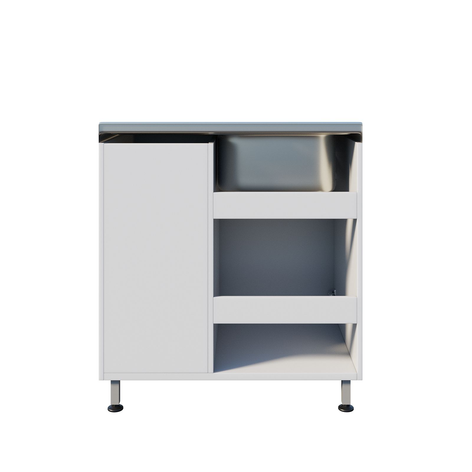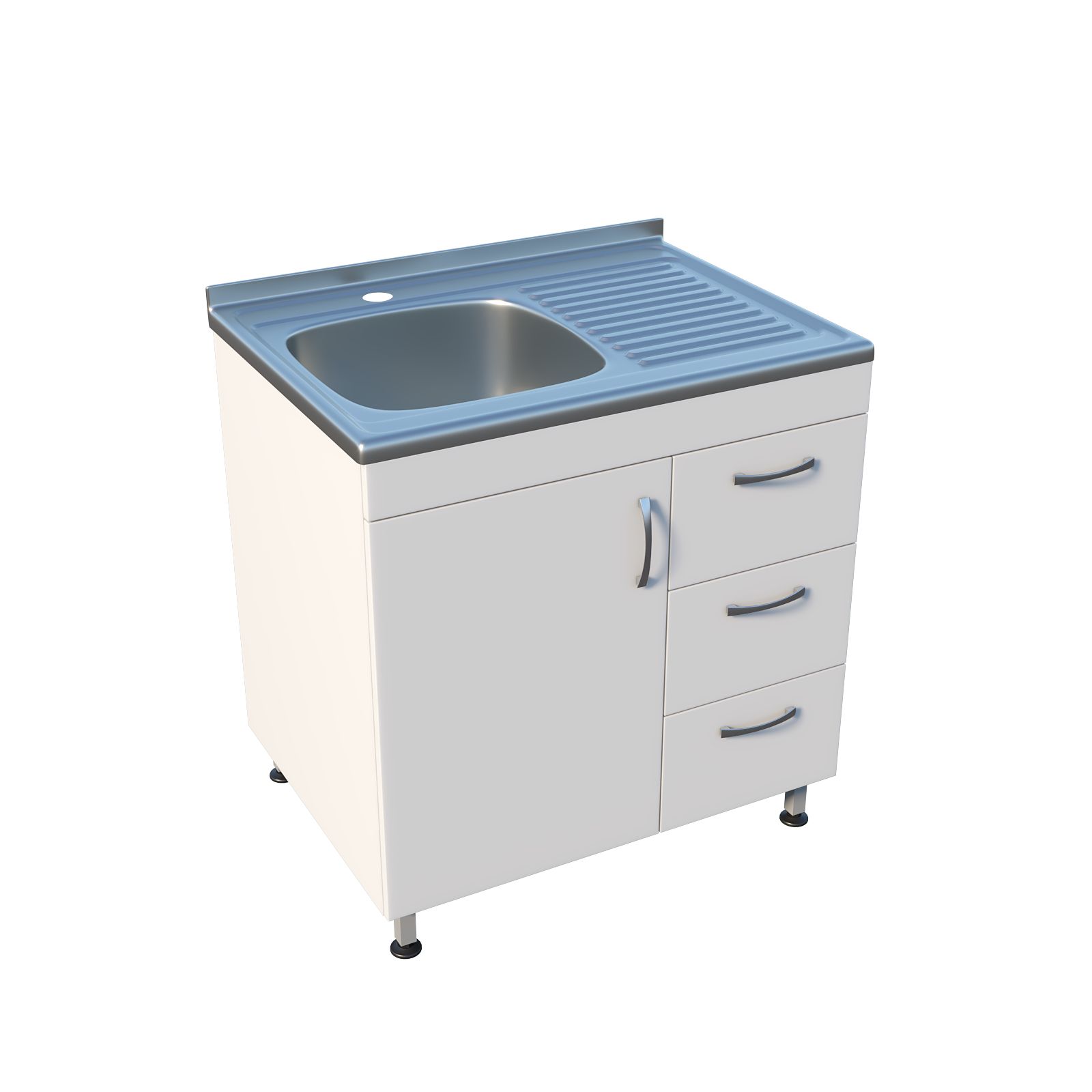 Корпус выполнен из ЛДСП, а накладная мойка и рабочая поверхность изготовлены из нержавеющей стали — оптимально для регулярной эксплуатации и влажной уборки. Слева предусмотрено отделение с дверцей для хранения принадлежностей, справа расположены три одинаковых выдвижных ящика для мелких инструментов и материалов. Устойчивость обеспечивает сварной каркас на ножках, а хирургический локтевой смеситель делает использование особенно удобным в условиях, где важна гигиена и скорость работы.
