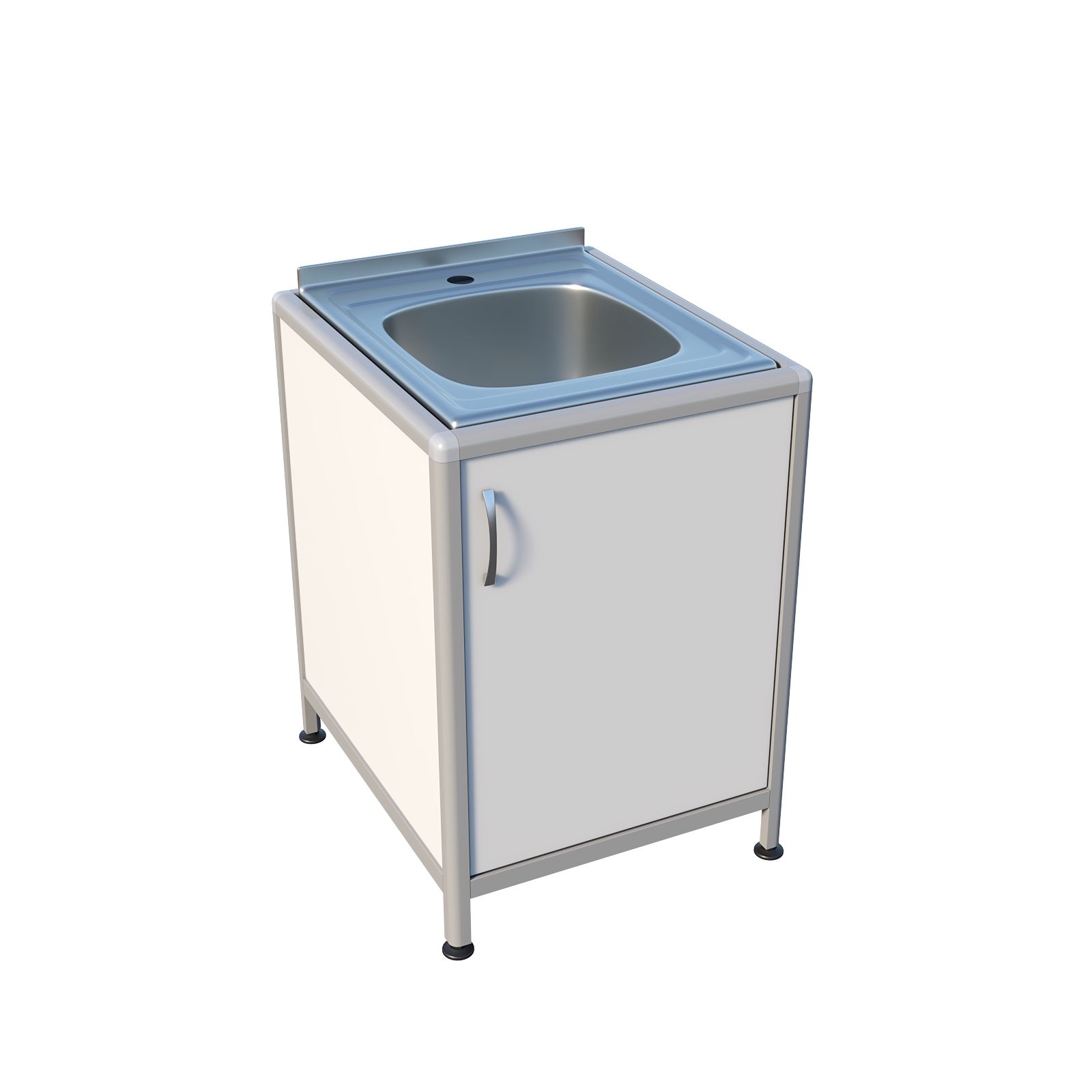 Основа выполнена на каркасе из алюминиевого профиля: конструкция получается лёгкой, аккуратной и устойчивой. Ножки являются продолжением профиля, что добавляет жёсткости и упрощает уход. Врезная одночашевая мойка удобна для повседневной работы, а пластиковое заполнение делает изделие неприхотливым в эксплуатации. Для комфорта персонала предусмотрен хирургический локтевой смеситель — им удобно пользоваться, когда руки заняты или требуется соблюдать повышенные требования к гигиене.