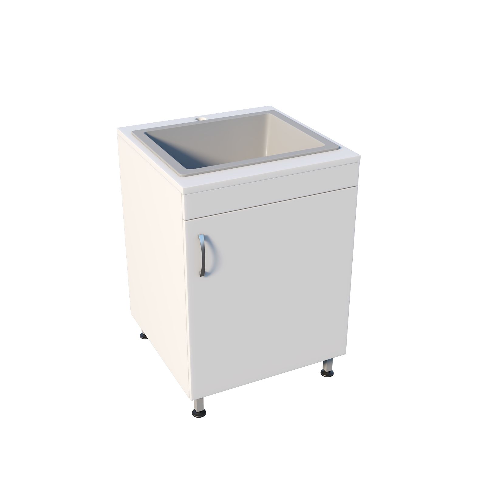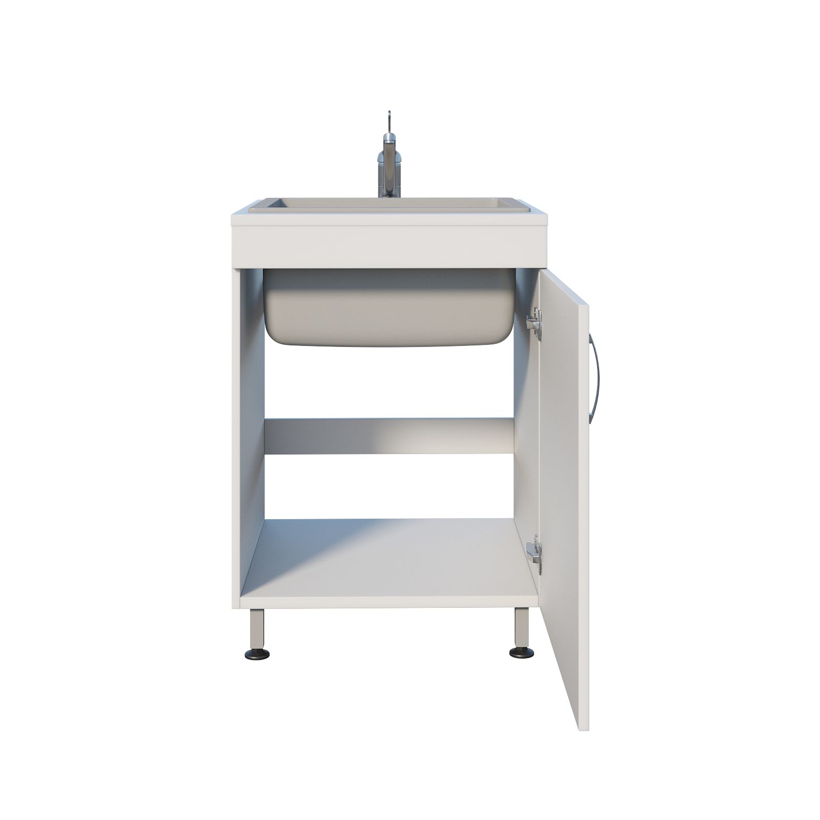 Тумба выполнена из ЛДСП, а распашная дверца закрывает внутреннее пространство для хранения принадлежностей. Врезная мойка Stegler из полипропилена подходит для повседневной эксплуатации, а устойчивость конструкции обеспечивает сварной каркас-основание. Для работы в медицинской среде предусмотрен хирургический локтевой смеситель — удобно, когда важна гигиена и быстрый доступ к воде.