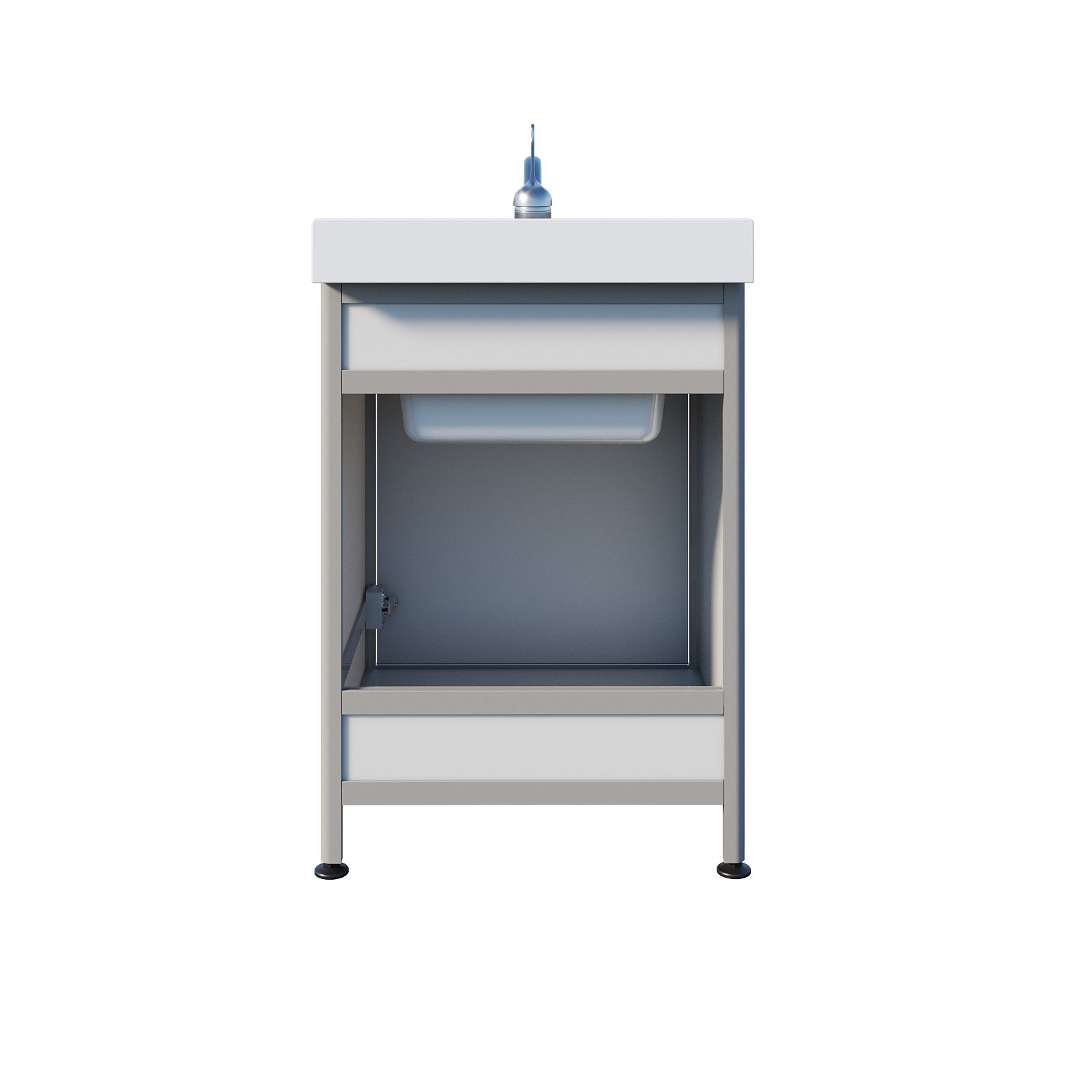 Основа конструкции выполнена из алюминиевого профиля: каркас получается легким, прочным и устойчивым к нагрузкам. Накладная чаша из литьевого мрамора хорошо переносит интенсивную эксплуатацию и легко приводится в порядок после работы. Корпус тумбы из ЛДСП закрывается распашной дверцей, а ножки являются продолжением алюминиевого профиля, за счет чего мойка выглядит аккуратно и собранно. Для удобства персонала предусмотрен хирургический локтевой смеситель — включение воды не требует касаться рычагов пальцами, что особенно уместно в медицинской среде.