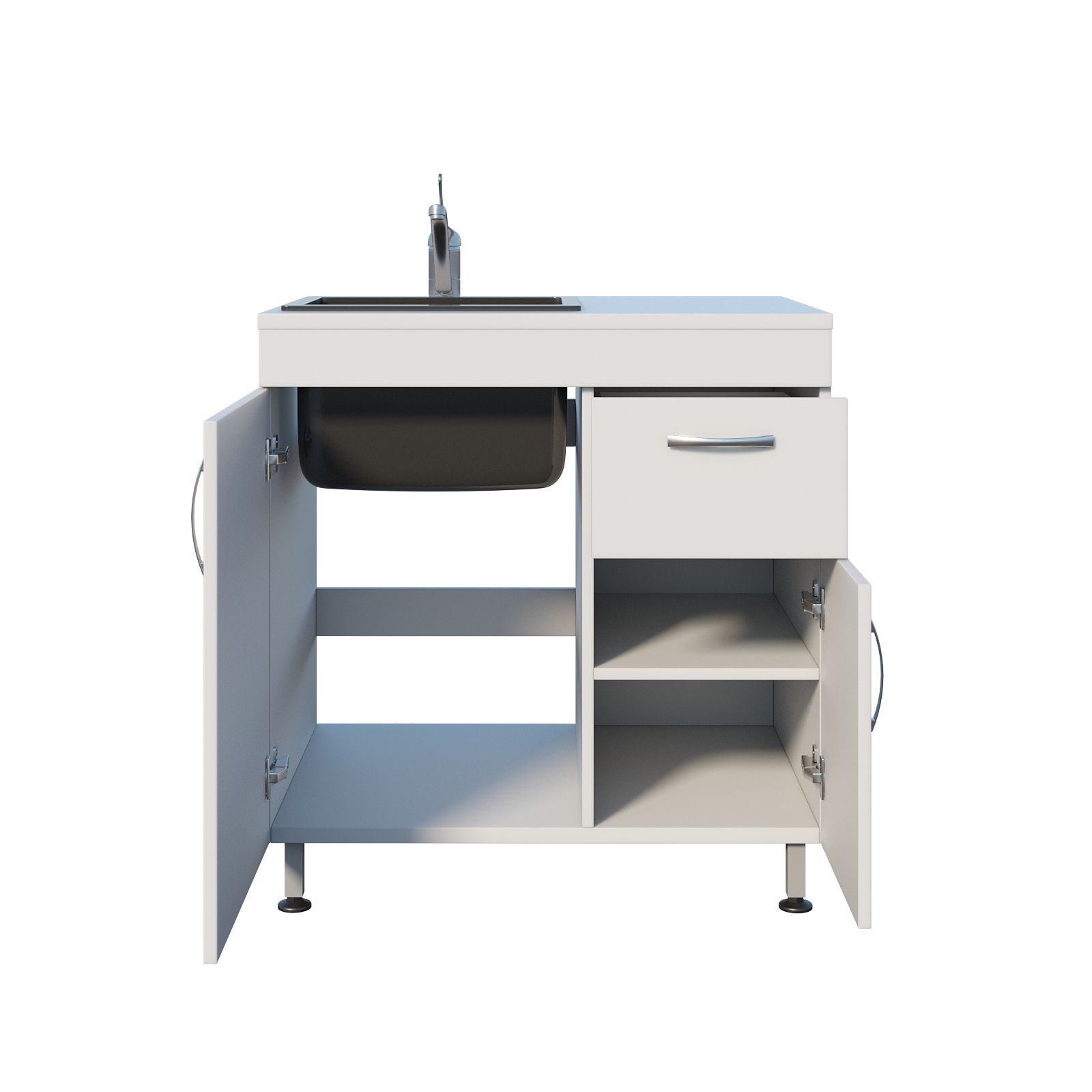 Корпус выполнен из ЛДСП, установлена врезная мойка Stegler. Под раковиной предусмотрено закрытое отделение с распашной дверцей, а по соседству — секция с выдвижным ящиком и дверцей; внутри размещена полка для хранения. Конструкция опирается на ножки в виде сварного каркаса, а хирургический локтевой смеситель позволяет включать воду без лишних касаний, что особенно удобно в медицинской среде.