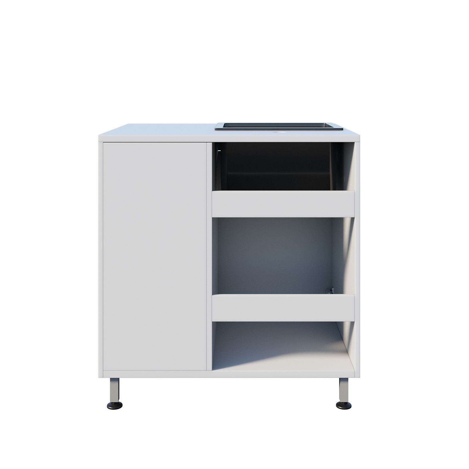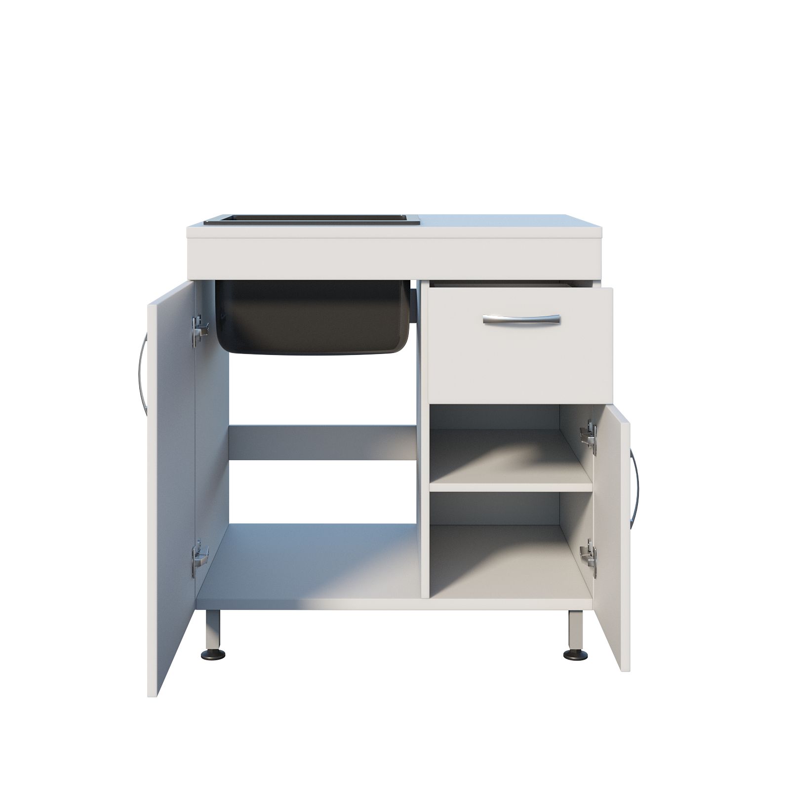 Система хранения продумана так, чтобы расходники и принадлежности не смешивались и всегда находились на своих местах. Под раковиной предусмотрено отделение с распашной дверцей для более габаритных предметов. Рядом расположено отдельное отделение с выдвижным ящиком и дверцей; внутри есть полка, на которой удобно хранить средства ухода, контейнеры или упаковки. Такой формат помогает организовать рабочее место без лишней суеты: то, что нужно часто, находится ближе и доступно быстрее.