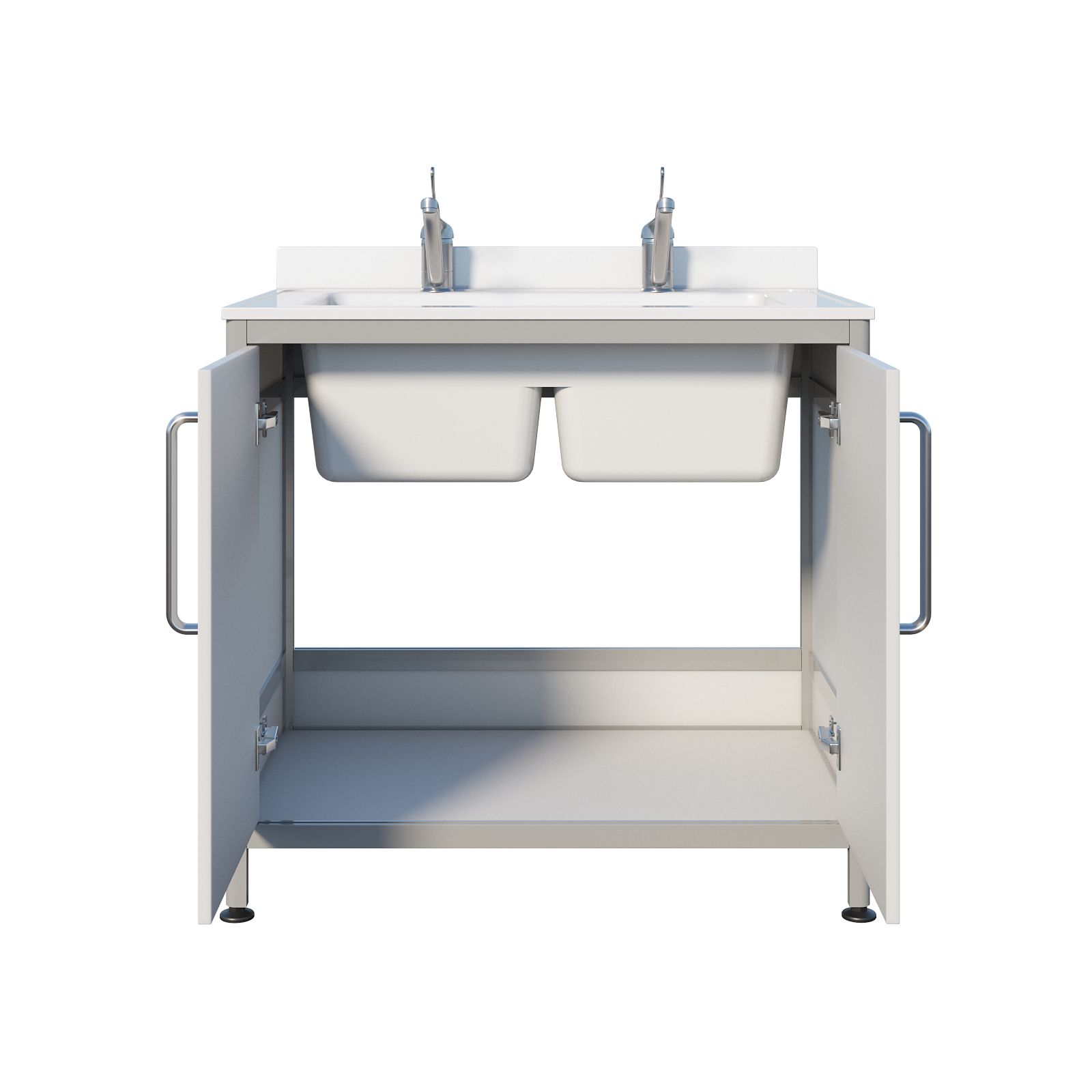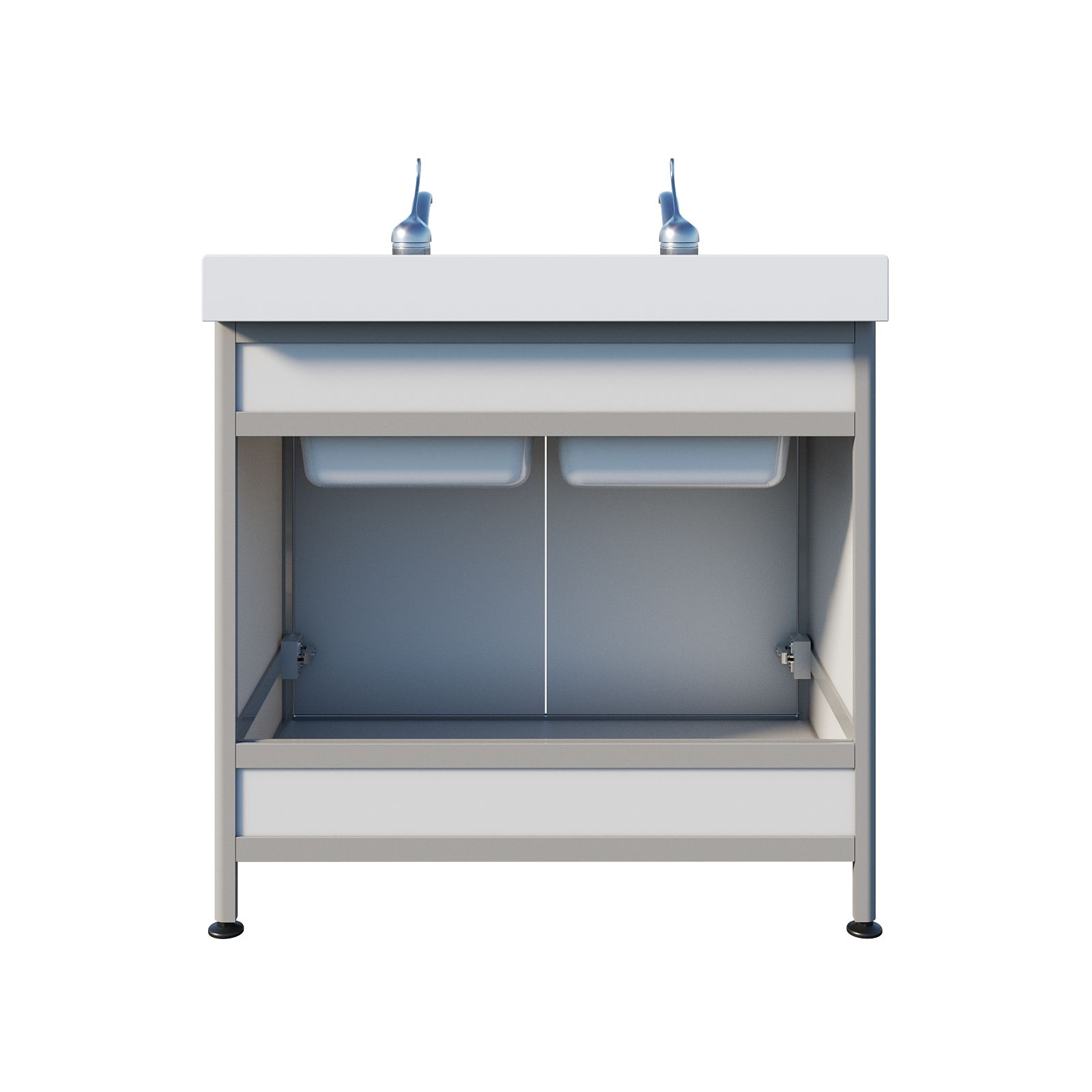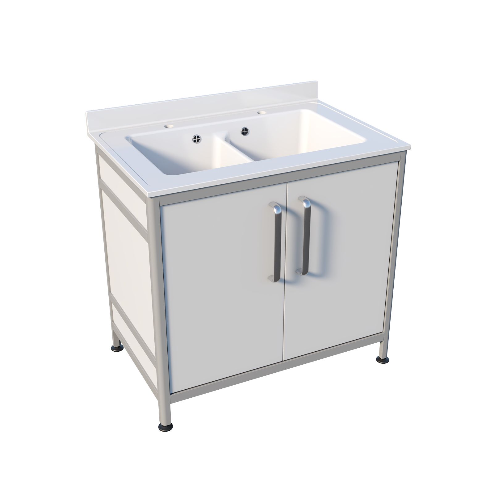 Основа конструкции выполнена из алюминиевого профиля, а белое пластиковое заполнение делает изделие визуально «чистым» и аккуратным. Накладная двухчашевая мойка из литьевого мрамора удобна, когда нужно разделить процессы: например, ополаскивание и основное мытьё или работу с разными типами принадлежностей. Тумба закрывается двумя распашными дверцами, а ножки являются продолжением алюминиевого профиля, благодаря чему конструкция выглядит цельно и устойчиво. Над каждой чашей установлен хирургический локтевой смеситель — удобно, когда руки заняты.