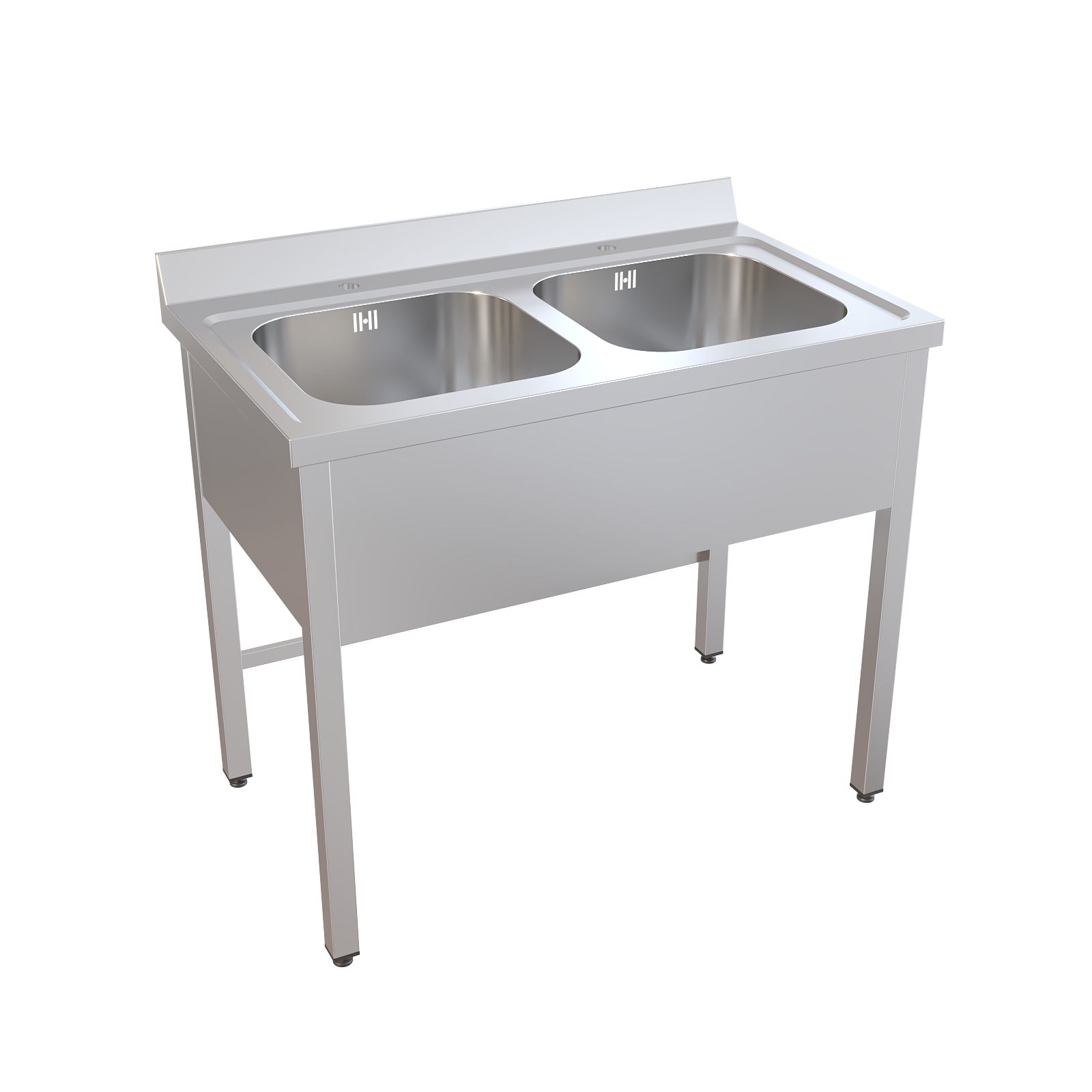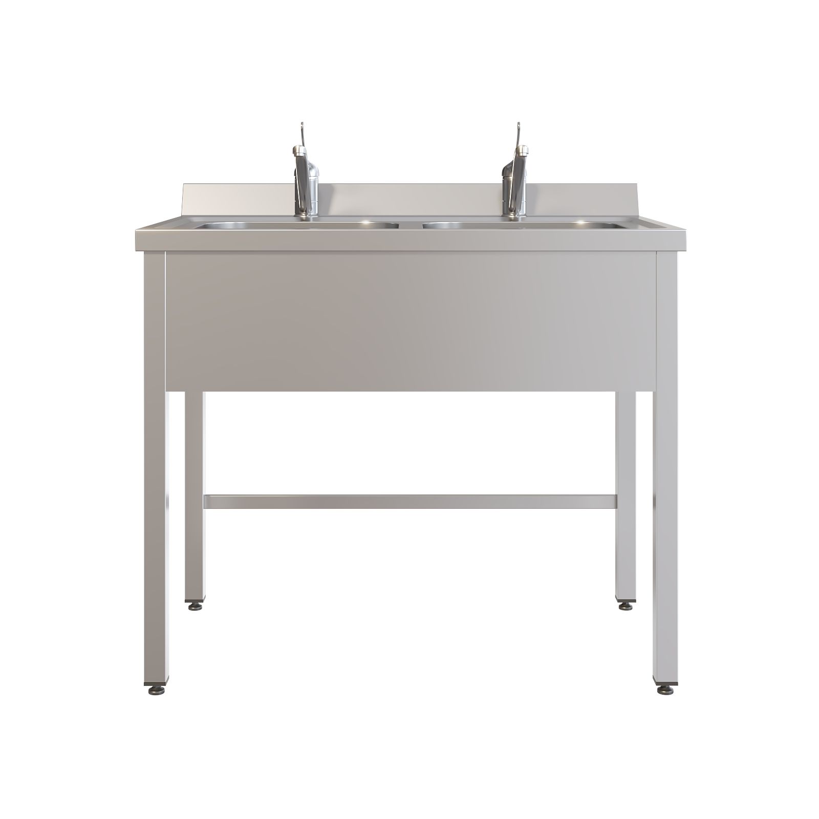 Конструкция полностью выполнена из нержавеющей стали AISI 304: прочный каркас из сварной трубы, двухчашевая раковина с пристеночным бортом, а также фартук с трёх сторон. С тыльной стороны предусмотрены две перемычки для дополнительной жёсткости, поэтому мойка уверенно держит нагрузку и сохраняет геометрию при активной эксплуатации. Для комфортной работы установлен хирургический локтевой смеситель над каждой чашей, а регулируемые по высоте опоры помогают точно выставить мойку по месту, даже если пол имеет небольшие перепады.