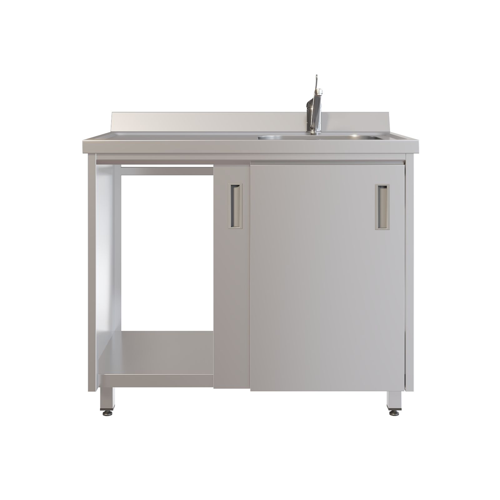 Мойка полностью выполнена из нержавеющей стали AISI 304. Одночашевая раковина дополнена удобной рабочей поверхностью слева и пристеночным бортом, который помогает защитить стену и рабочую зону от брызг. Под моечной зоной предусмотрено отделение с раздвижными дверями-купе — всё необходимое можно держать под рукой, не загромождая помещение. Установлен хирургический локтевой смеситель, а регулируемые по высоте опоры позволяют точно выставить мойку по уровню.