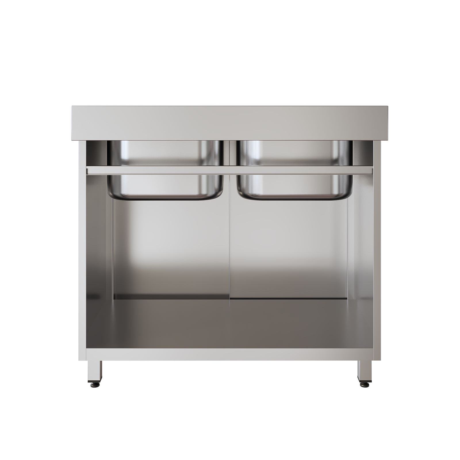Конструкция полностью выполнена из нержавеющей стали AISI 304, поэтому мойка уверенно переносит ежедневную интенсивную эксплуатацию. Двухчашевая раковина с пристеночным бортом помогает аккуратно организовать рабочий процесс и защитить стену от брызг. Под мойкой предусмотрено закрытое отделение с дверями-купе — удобно хранить расходники и инвентарь, не загромождая помещение. Над каждой чашей установлен хирургический локтевой смеситель, что особенно комфортно в условиях, где важна минимизация контакта руками. Регулируемые по высоте опоры позволяют точно выставить мойку по месту, даже если пол не идеален.