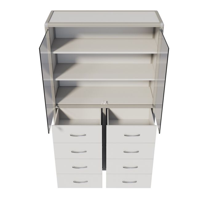 Дверцы шкафа изготовлены из стекла, что добавляет легкости и прозрачности дизайну. Полки, дверцы и выдвижные ящики в нижней секции делают использование шкафа удобным и практичным. Дополнительные опции позволяют выбрать индивидуальное цветовое исполнение, соответствующее интерьеру помещения.