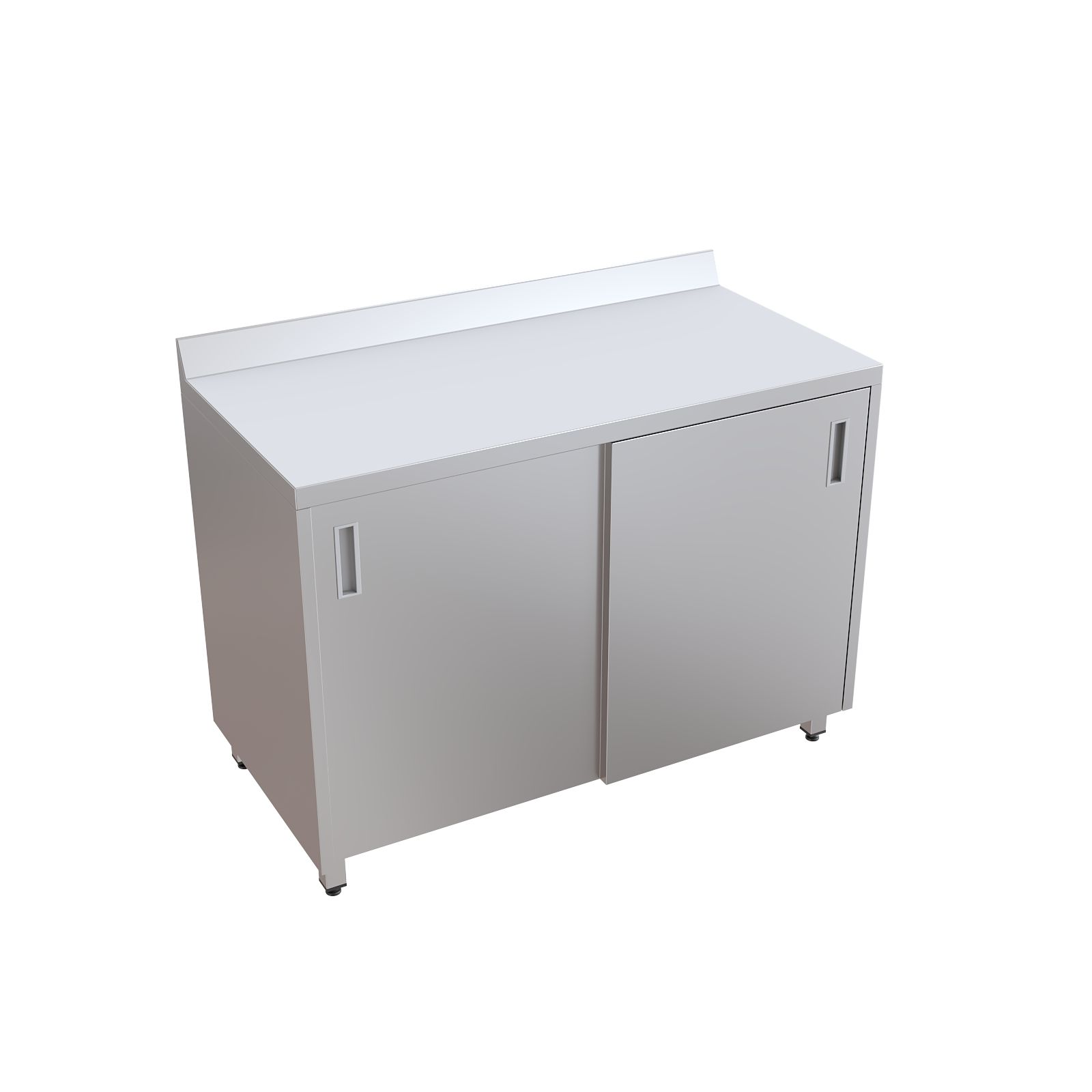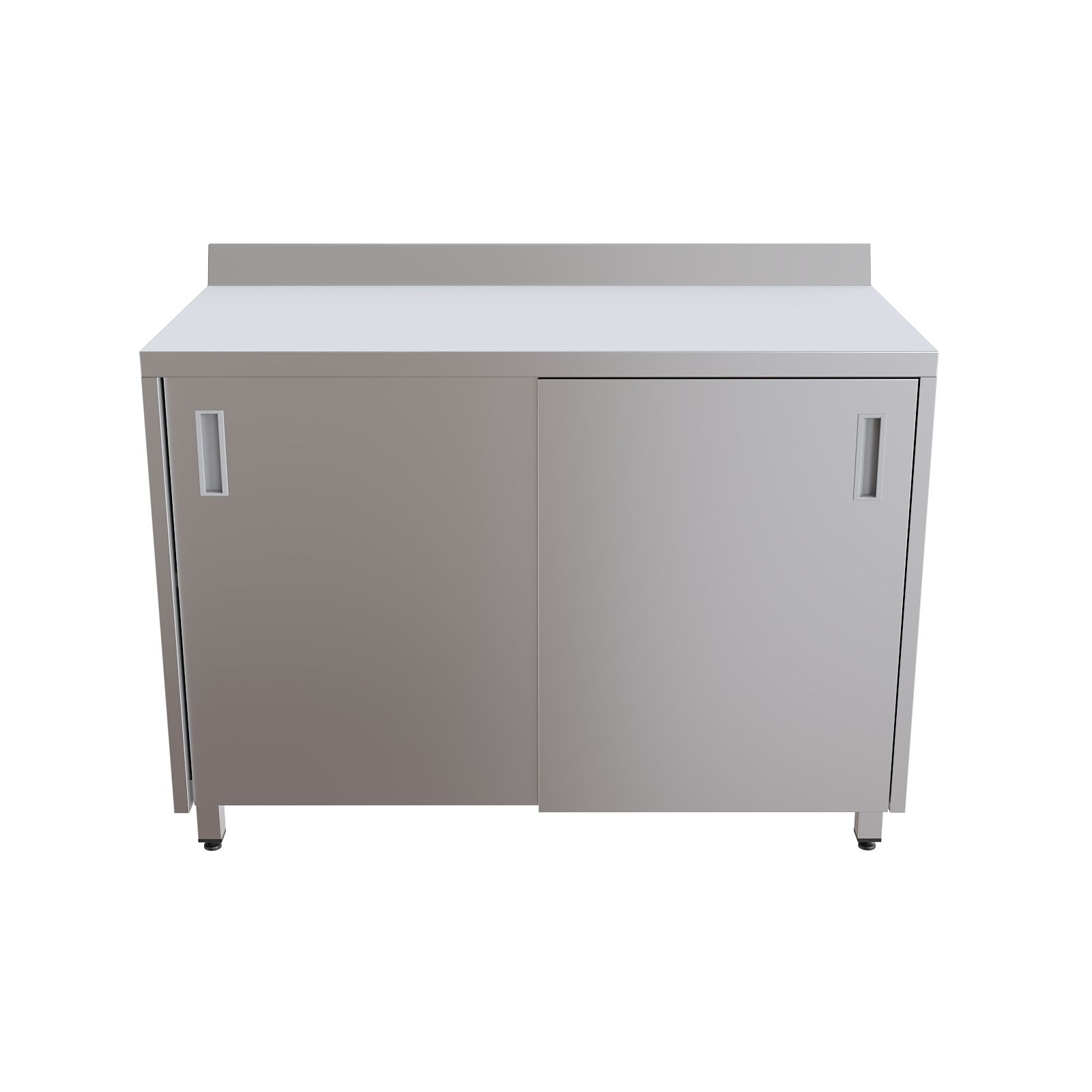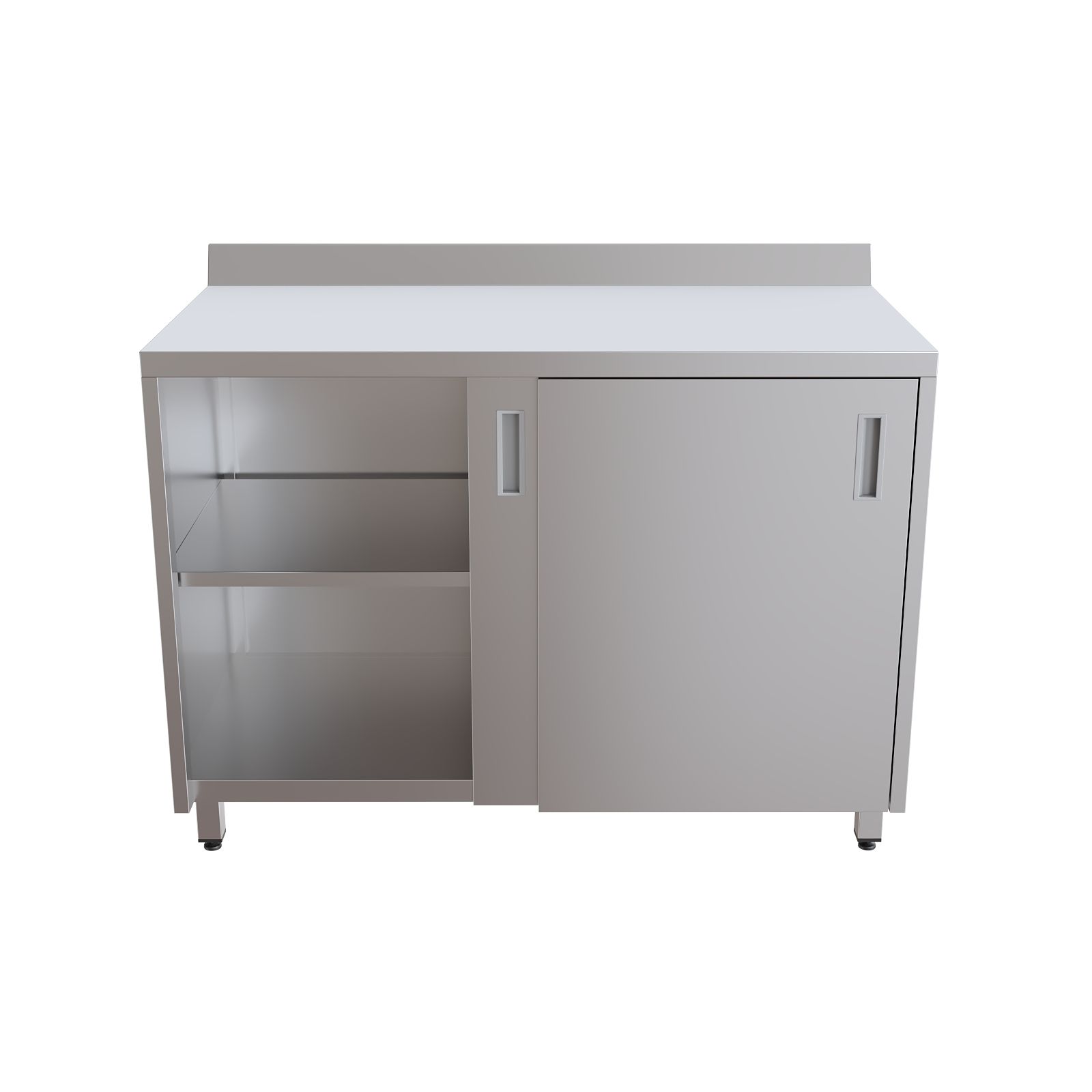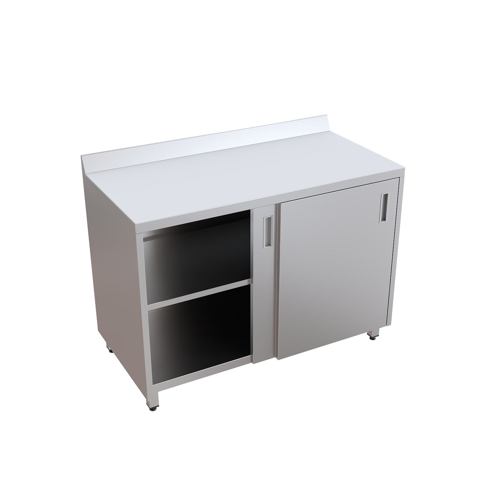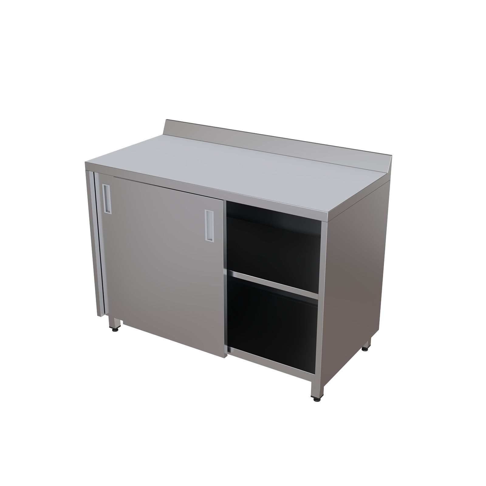 Модель оснащена столешницей с бортом для предотвращения скатывания предметов, двумя раздвижными дверями-купе и внутренней полкой для рациональной организации пространства. Шкаф установлен на четырех регулируемых по высоте опорах, что обеспечивает устойчивость и позволяет компенсировать неровности пола.
