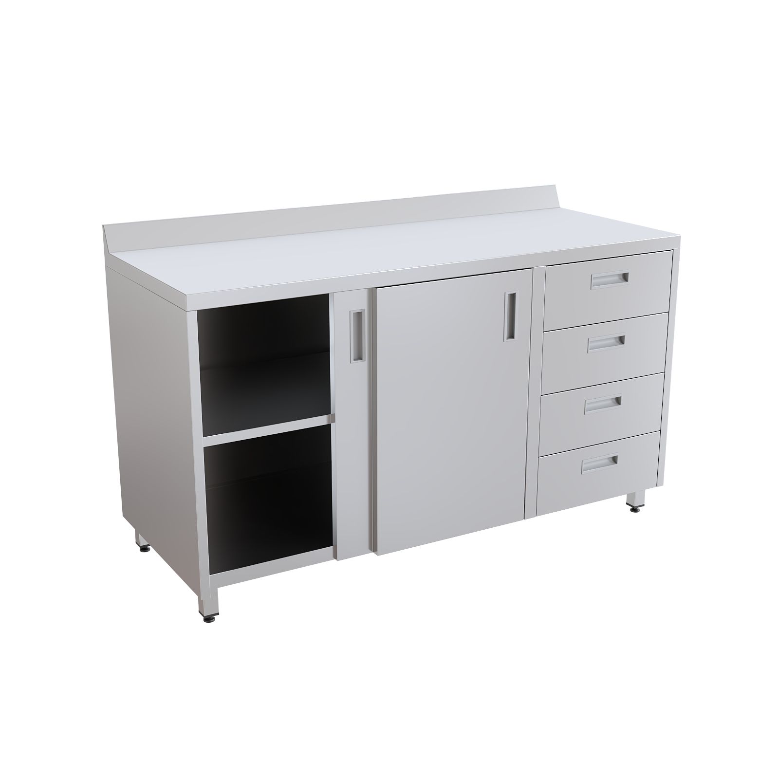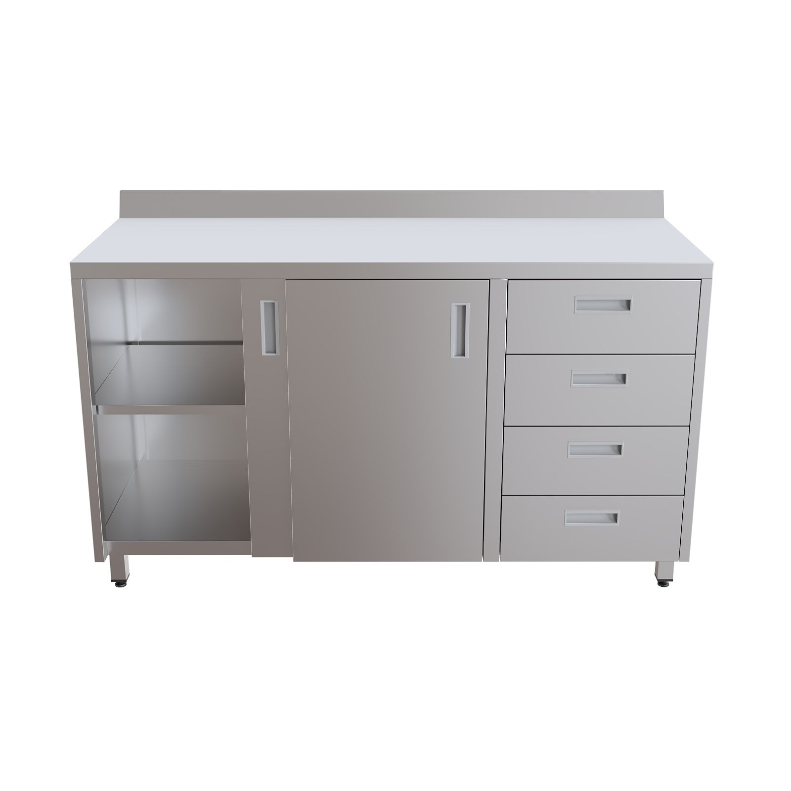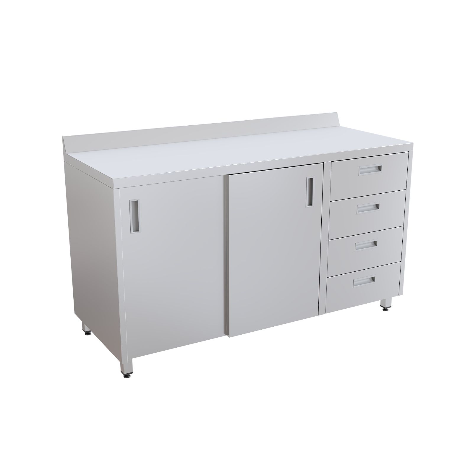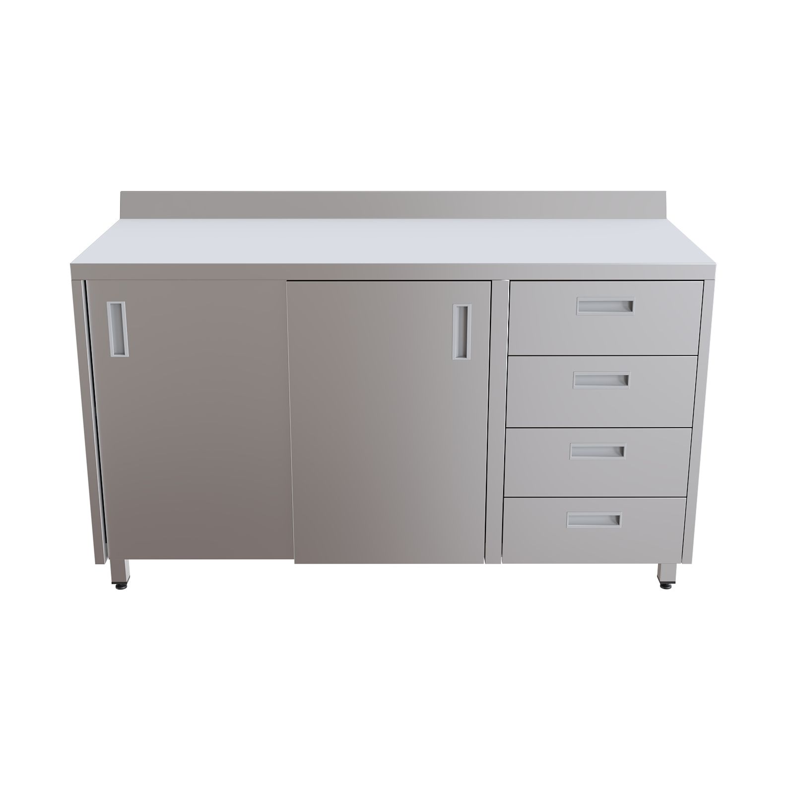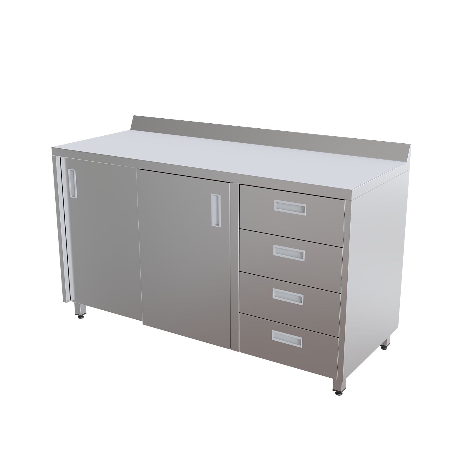 Шкаф оснащен столешницей с защитным бортом и установлен на четыре опоры с возможностью регулировки высоты. Система хранения включает две раздвижные двери типа "купе", за которыми расположена полка, а также четыре выдвижных ящика для удобной организации медицинского инвентаря.