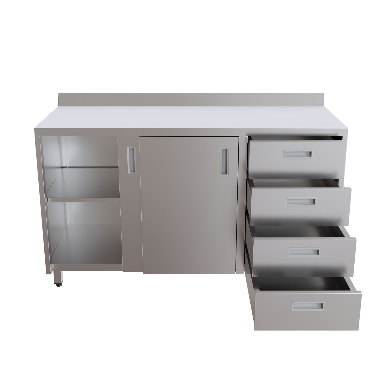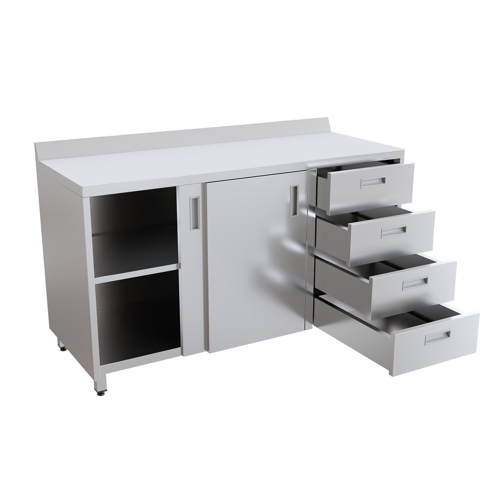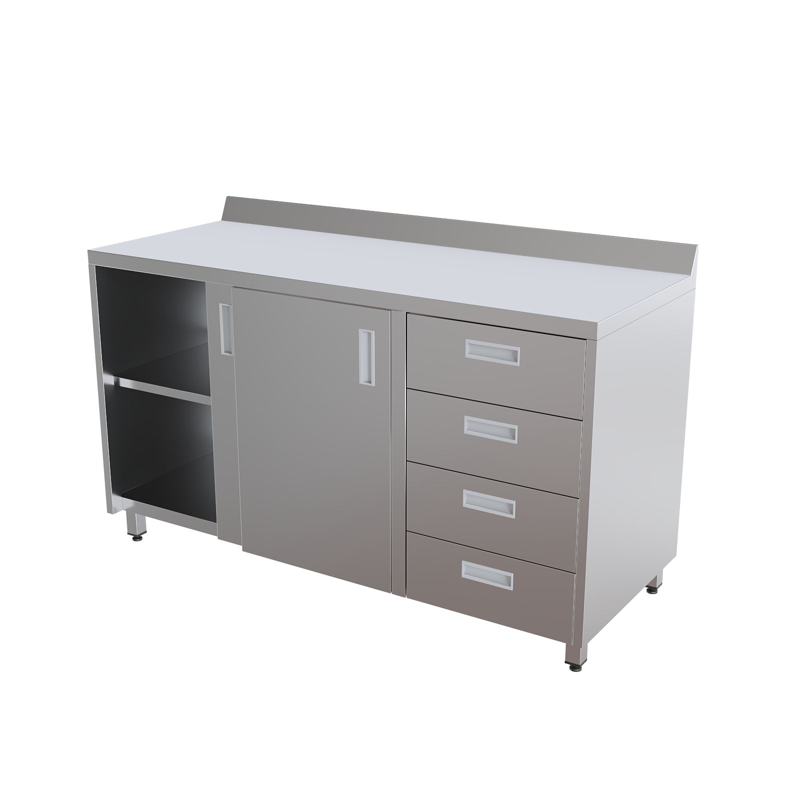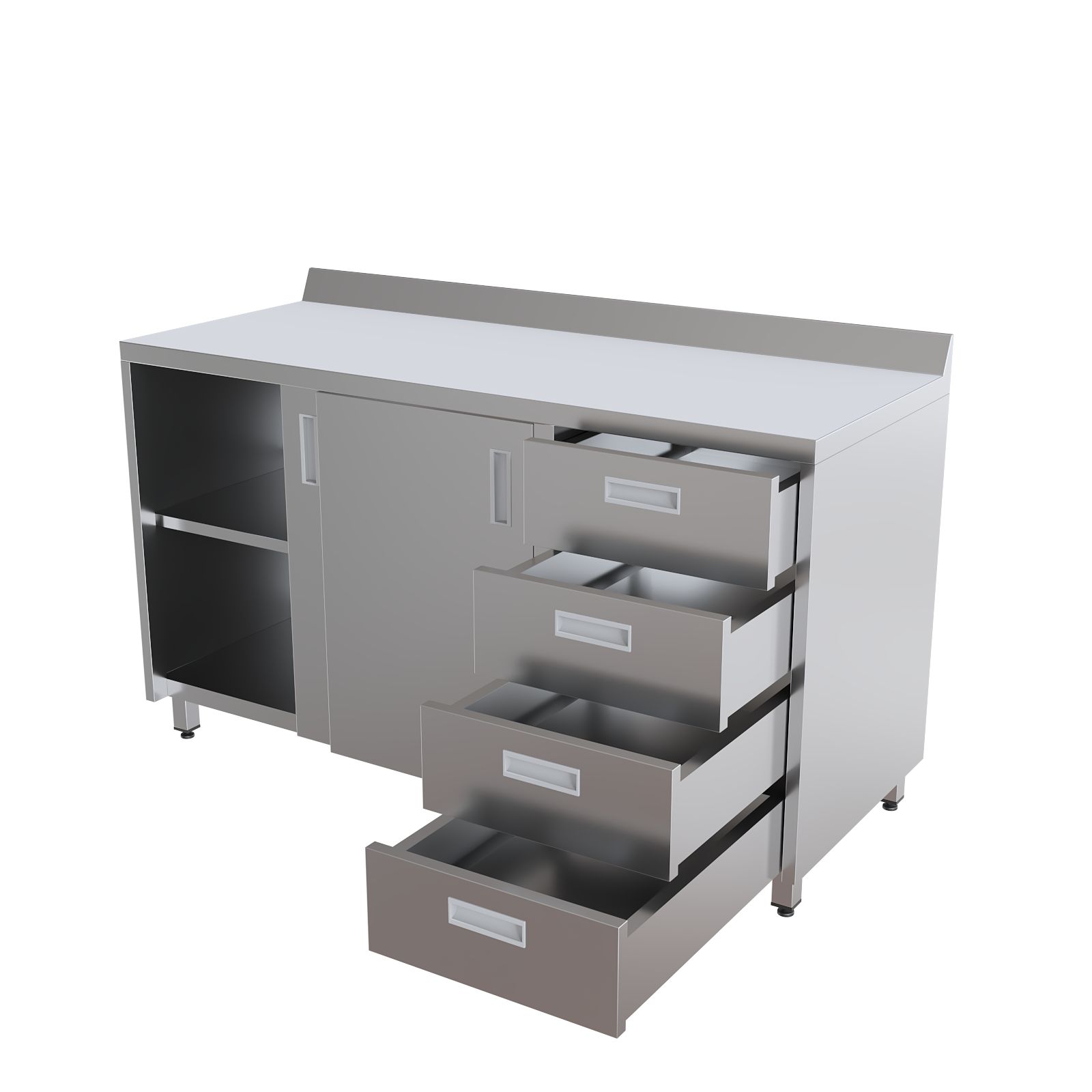 Фасадная часть организована по принципу эргономичного зонирования. Секция с двумя дверями-купе обеспечивает быстрый доступ к внутренней полке, при этом створки не перекрывают проход и не мешают перемещению персонала в узких коридорах и кабинетах. Блок из четырёх выдвижных ящиков предназначен для аккуратного размещения мелкого инструментария, лекарственных препаратов, перевязочных средств и расходных материалов, требующих сортировки и систематизации. Каждая полка и ящик рассчитаны на равномерно распределённую нагрузку до 20 кг, что позволяет безопасно хранить тяжёлые емкости, биксы и наборы инструментов.