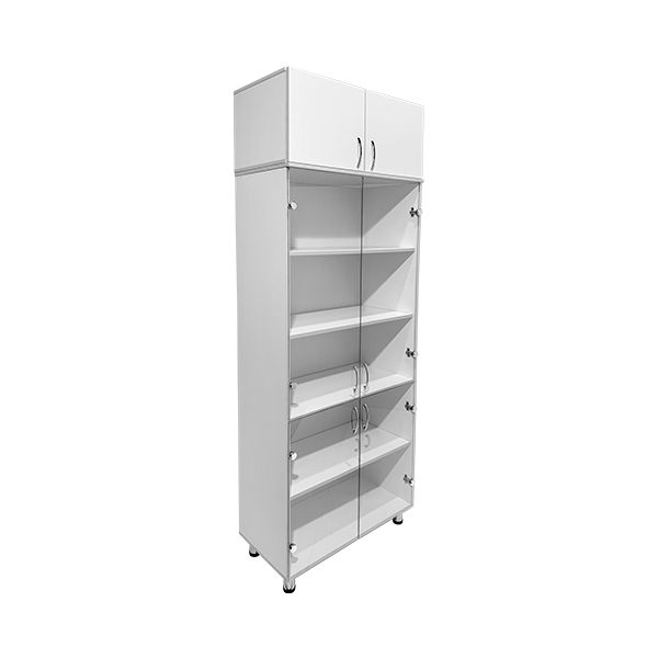 Изготовленный из ЛДСП высокого качества, средние и нижние дверцы которого выполнены из стекла, шкаф СТР МД 103.18 с антресолью СТР МД 112.02 не только обеспечивает надежное хранение документов, но и придает интерьеру медицинского учреждения стильный и современный вид.