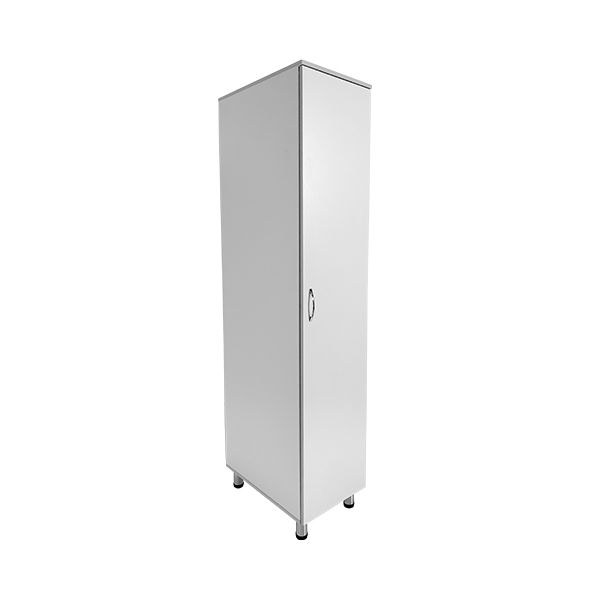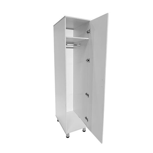 Специально разработанная модель шкафа оснащена четырьмя полками, штангой для тремпелей, дверцей, и регулируемыми по высоте ножками. Эти функциональные элементы обеспечивают упорядоченное и удобное хранение рабочей одежды, обуви и аксессуаров, делая процесс организации рабочего пространства максимально эффективным.