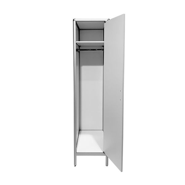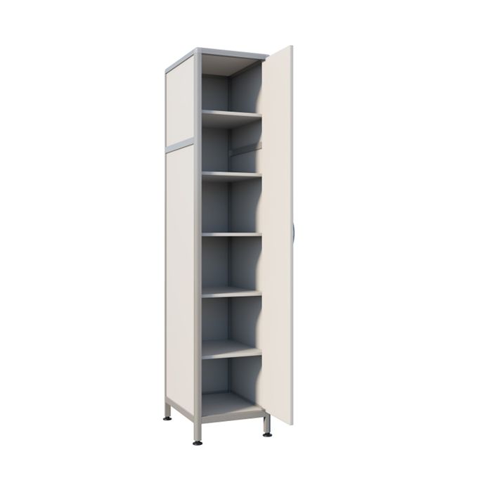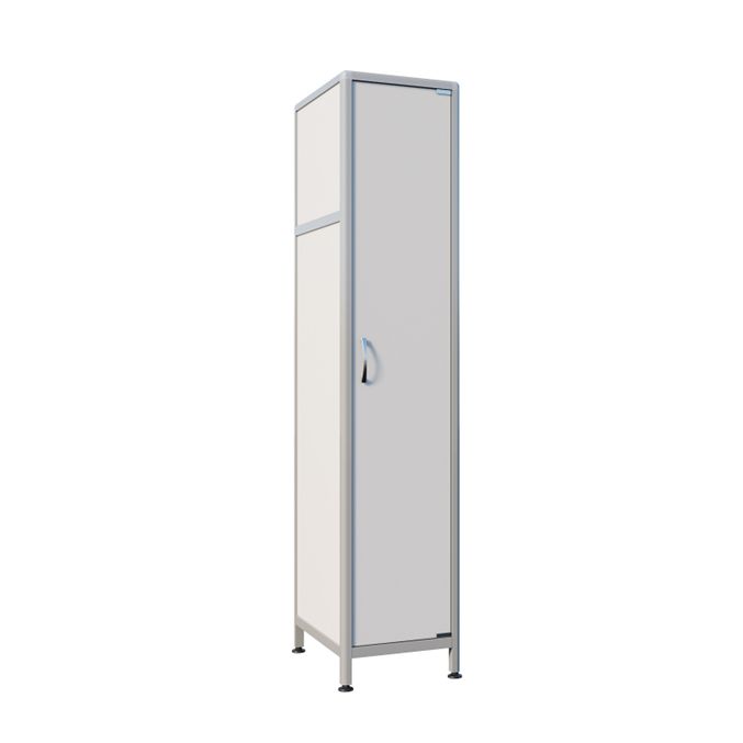 Каркас из алюминиевого профиля с порошковым покрытием обеспечивает прочность, устойчивость и долговечность конструкции, а регулируемые по высоте ножки позволяют установить шкаф на различных поверхностях, обеспечивая стабильность и комфорт в использовании. Удобство хранения лабораторной одежды обеспечивается полками и штангой для тремпелей.