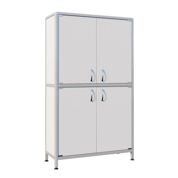 Конструкция шкафа обеспечивает жесткость, устойчивость и прочность благодаря использованию алюминиевого профиля в качестве каркаса. Покрытие каркаса порошковой краской обеспечивает устойчивость к внешним воздействиям и придает шкафу эстетичный внешний вид. Регулируемые по высоте ножки позволяют установить шкаф даже на неровной поверхности, обеспечивая устойчивость и надежность.