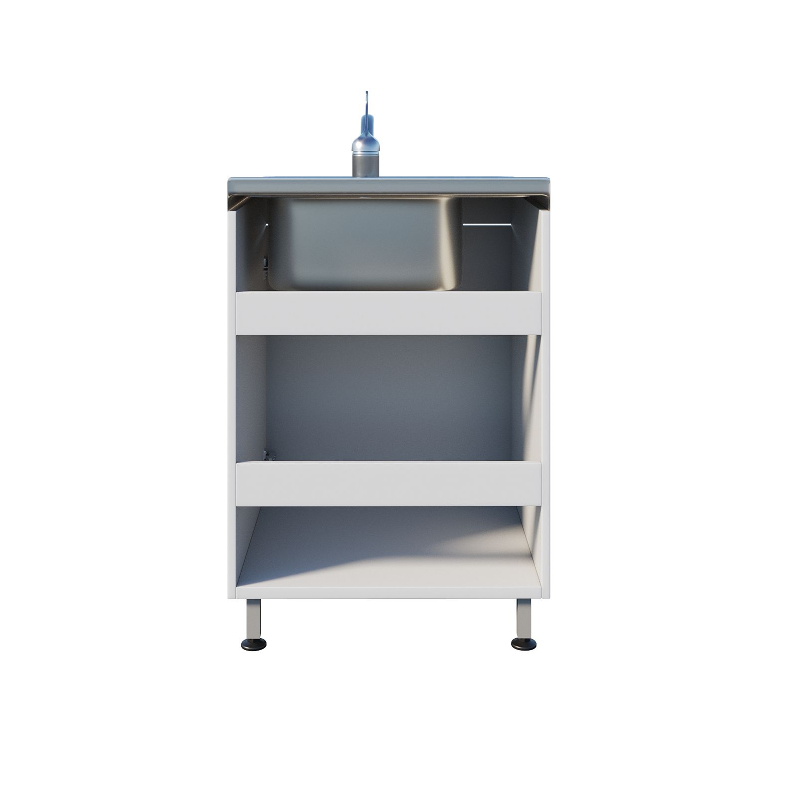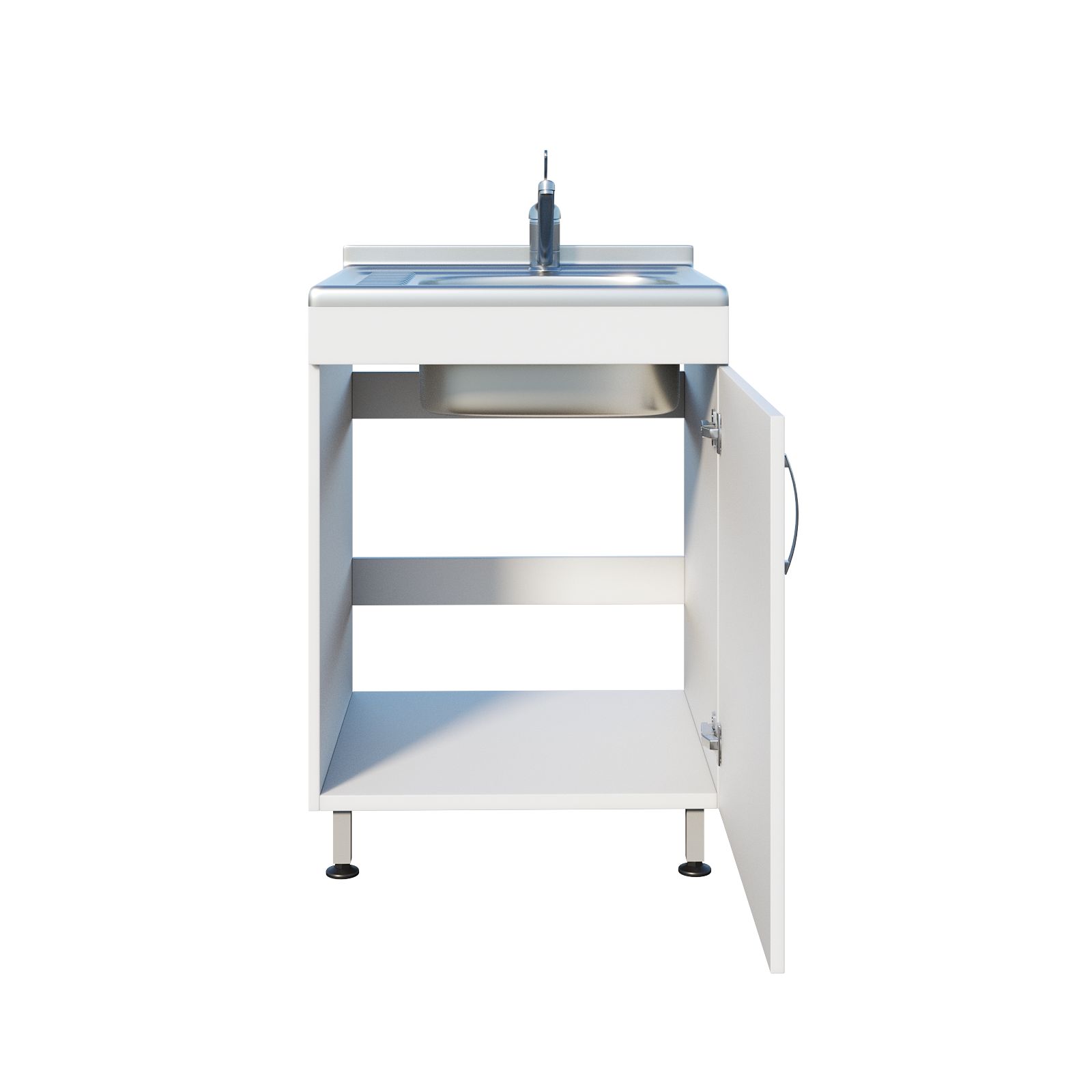 Мойка оснащена тумбой под мойкой с распашной дверцей, что обеспечивает удобный доступ к хранимым материалам. Регулируемые по высоте ножки с винтовыми опорами-регуляторами позволяют установить мойку даже на неровной поверхности, обеспечивая устойчивость и комфорт во время работы. Чаша с хирургическим локтевым смесителем и сушилкой устанавливаются сверху для удобства использования и обслуживания.