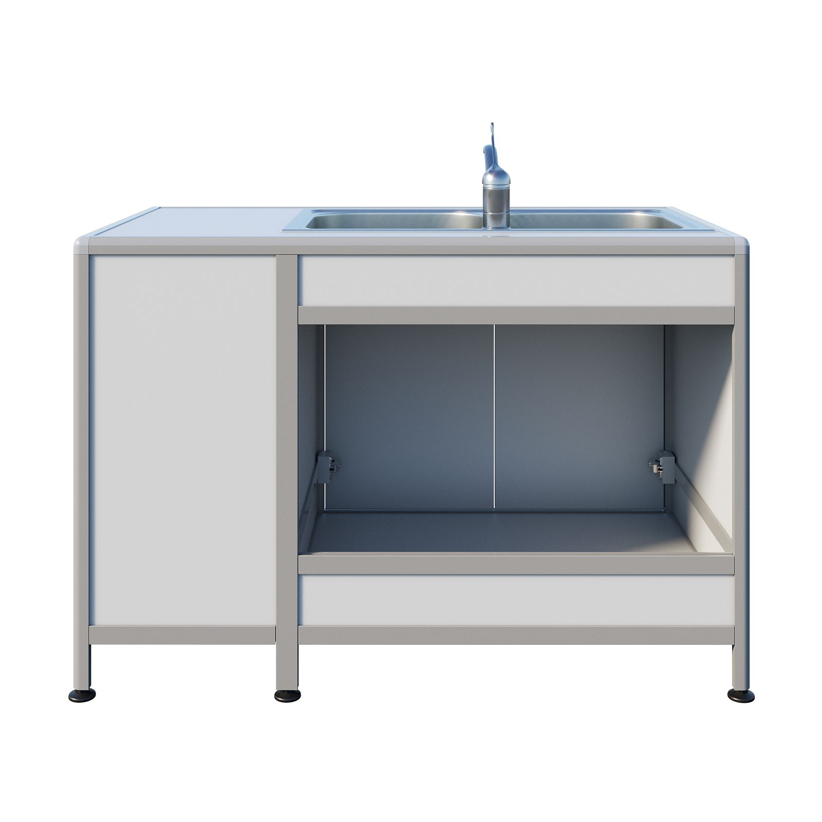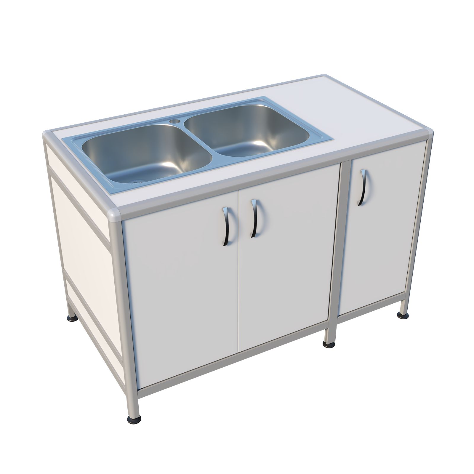Медицинская мойка ММ 13.005al предназначена для оснащения лабораторий и других медицинских учреждений. Конструкция выполнена на основе алюминиевого каркаса с облицовкой из ЛДСП толщиной 8 мм. В верхней части установлена врезная двухчашевая мойка, рядом расположена столешница, удобная для размещения посуды.