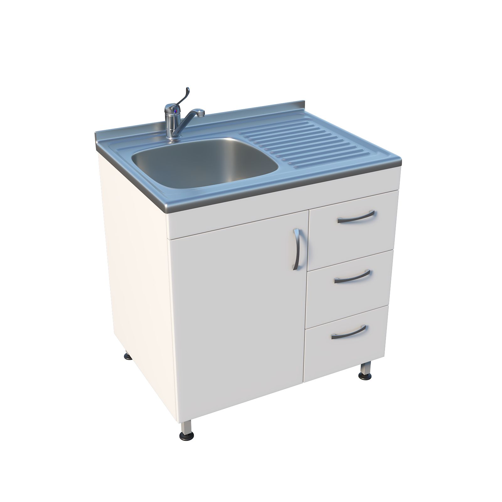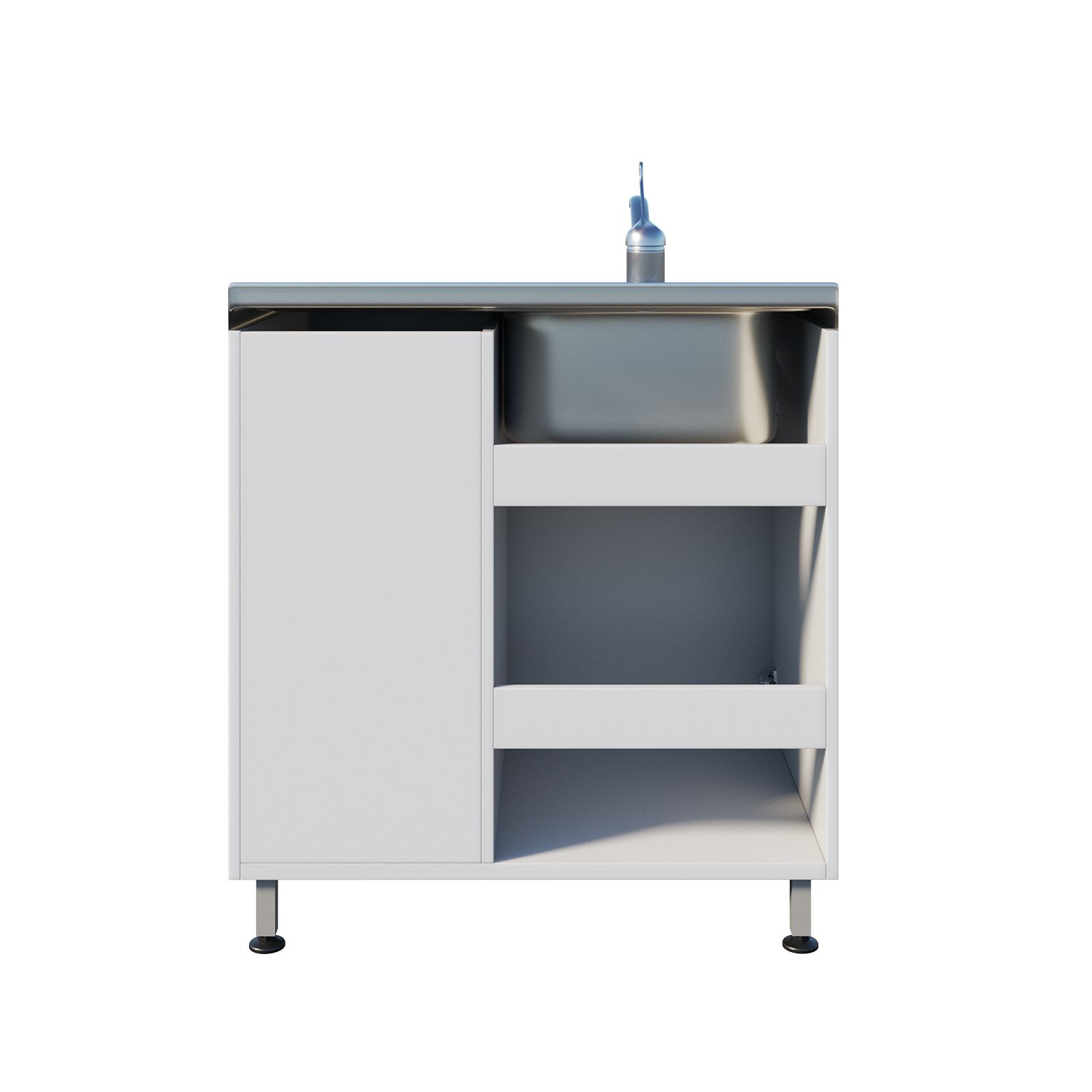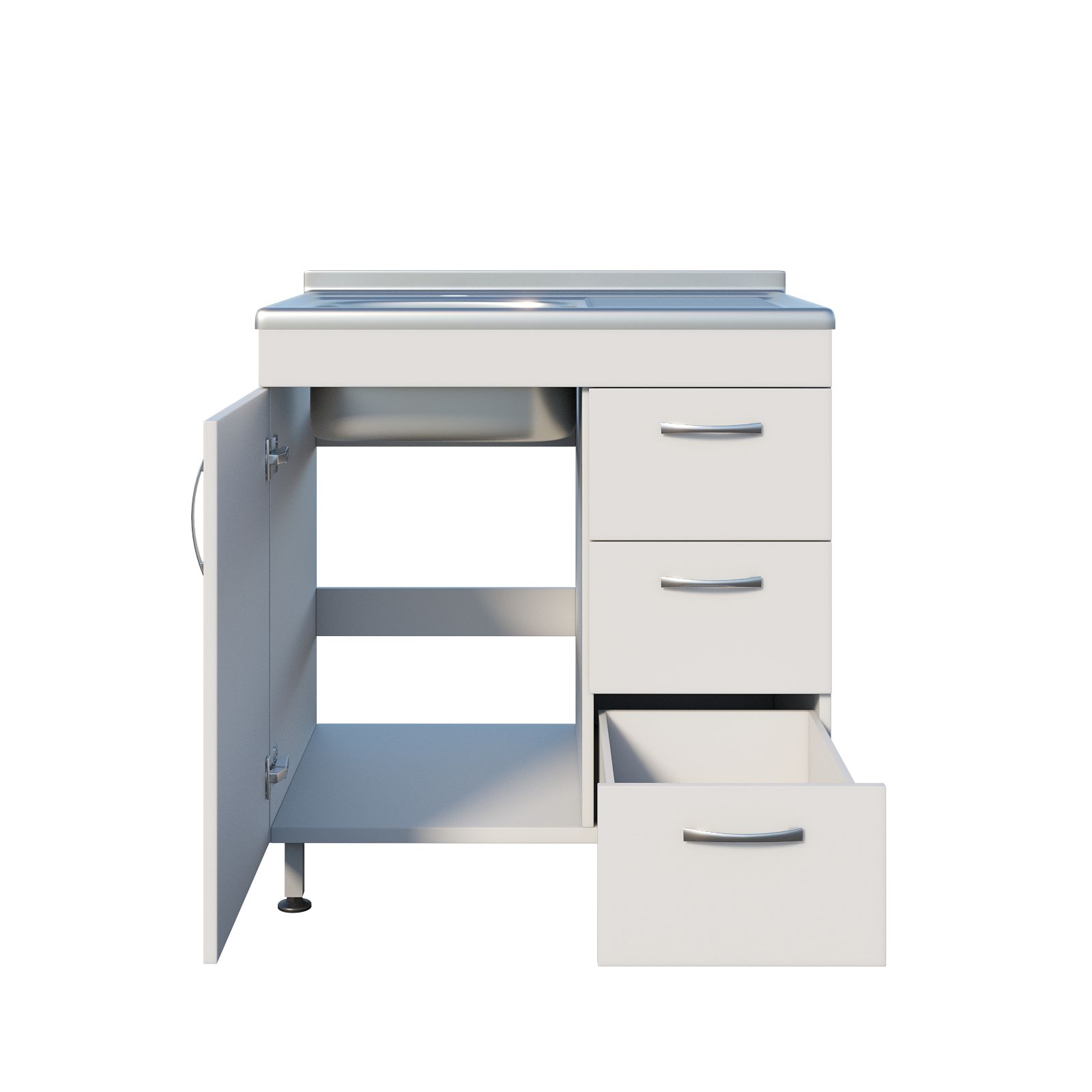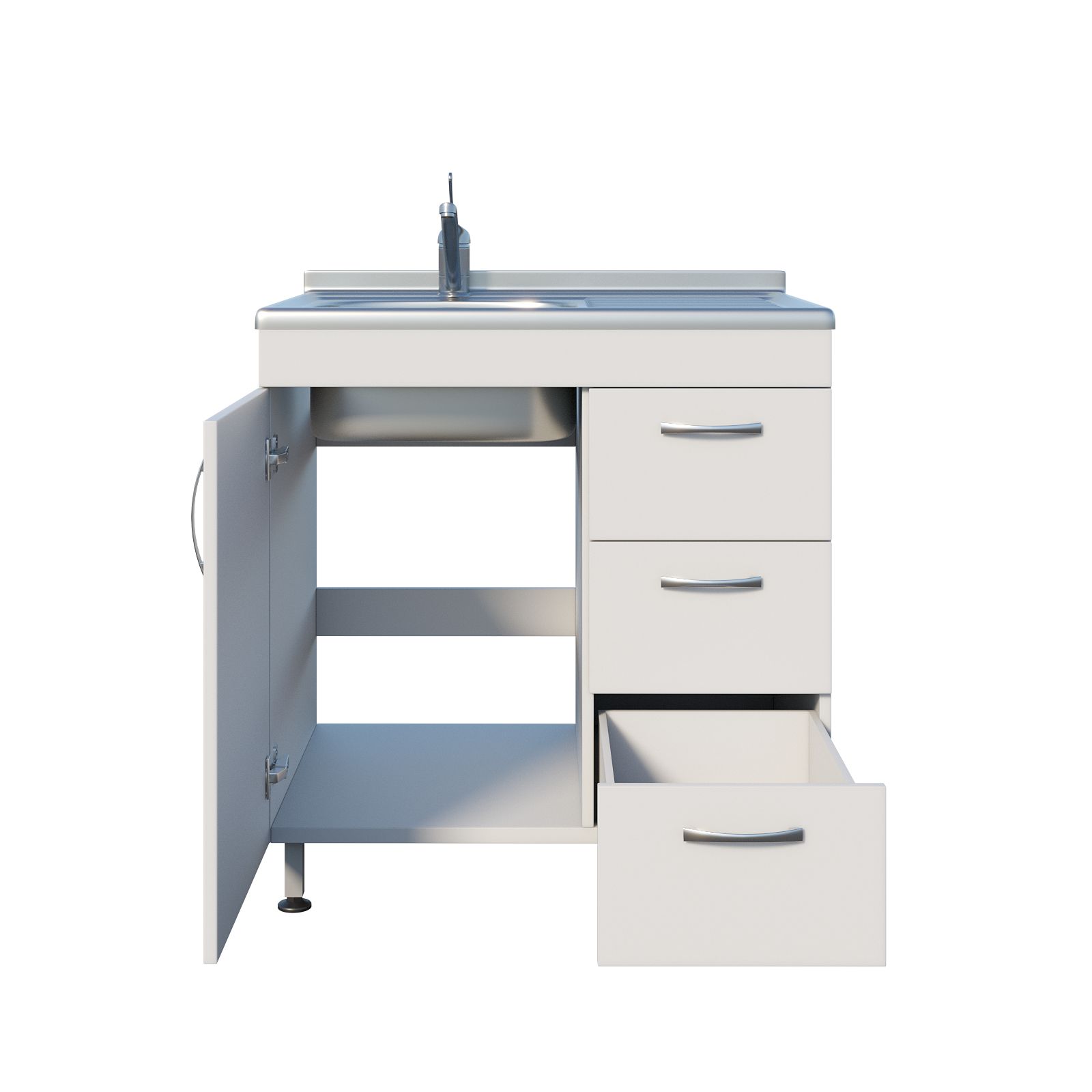 Корпус выполнен из ЛДСП, а накладная мойка и рабочая поверхность изготовлены из нержавеющей стали — оптимально для регулярной эксплуатации и влажной уборки. Слева предусмотрено отделение с дверцей для хранения принадлежностей, справа расположены три одинаковых выдвижных ящика для мелких инструментов и материалов. Устойчивость обеспечивает сварной каркас на ножках, а хирургический локтевой смеситель делает использование особенно удобным в условиях, где важна гигиена и скорость работы.