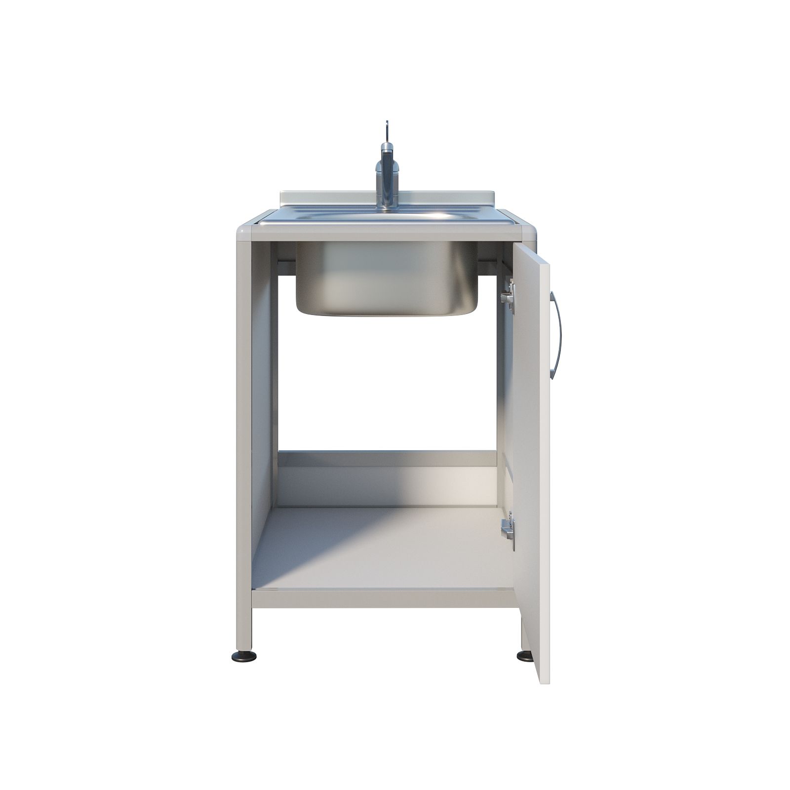 Основа выполнена на каркасе из алюминиевого профиля: конструкция получается лёгкой, аккуратной и устойчивой. Ножки являются продолжением профиля, что добавляет жёсткости и упрощает уход. Врезная одночашевая мойка удобна для повседневной работы, а пластиковое заполнение делает изделие неприхотливым в эксплуатации. Для комфорта персонала предусмотрен хирургический локтевой смеситель — им удобно пользоваться, когда руки заняты или требуется соблюдать повышенные требования к гигиене.