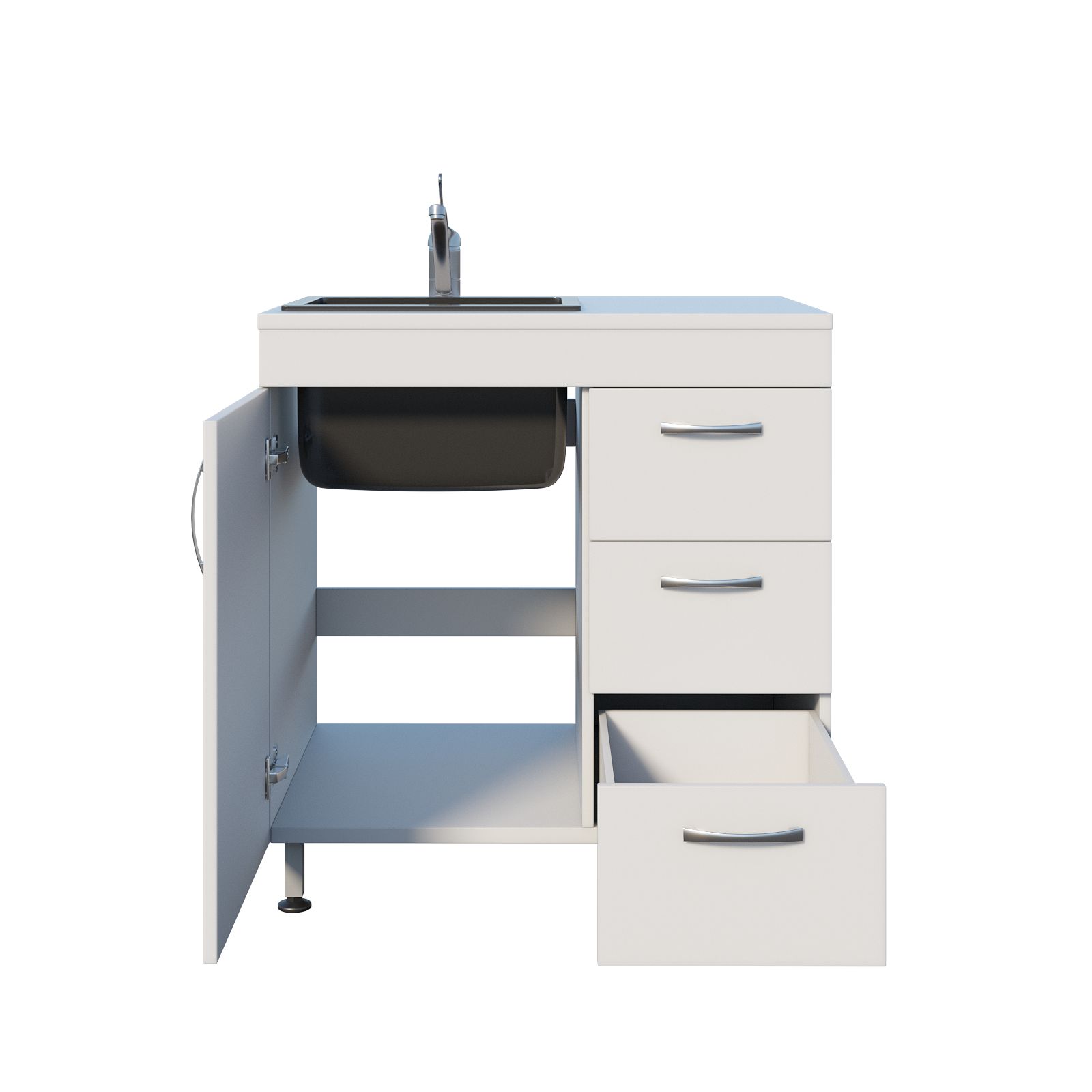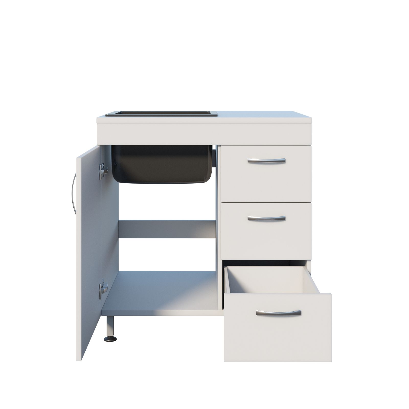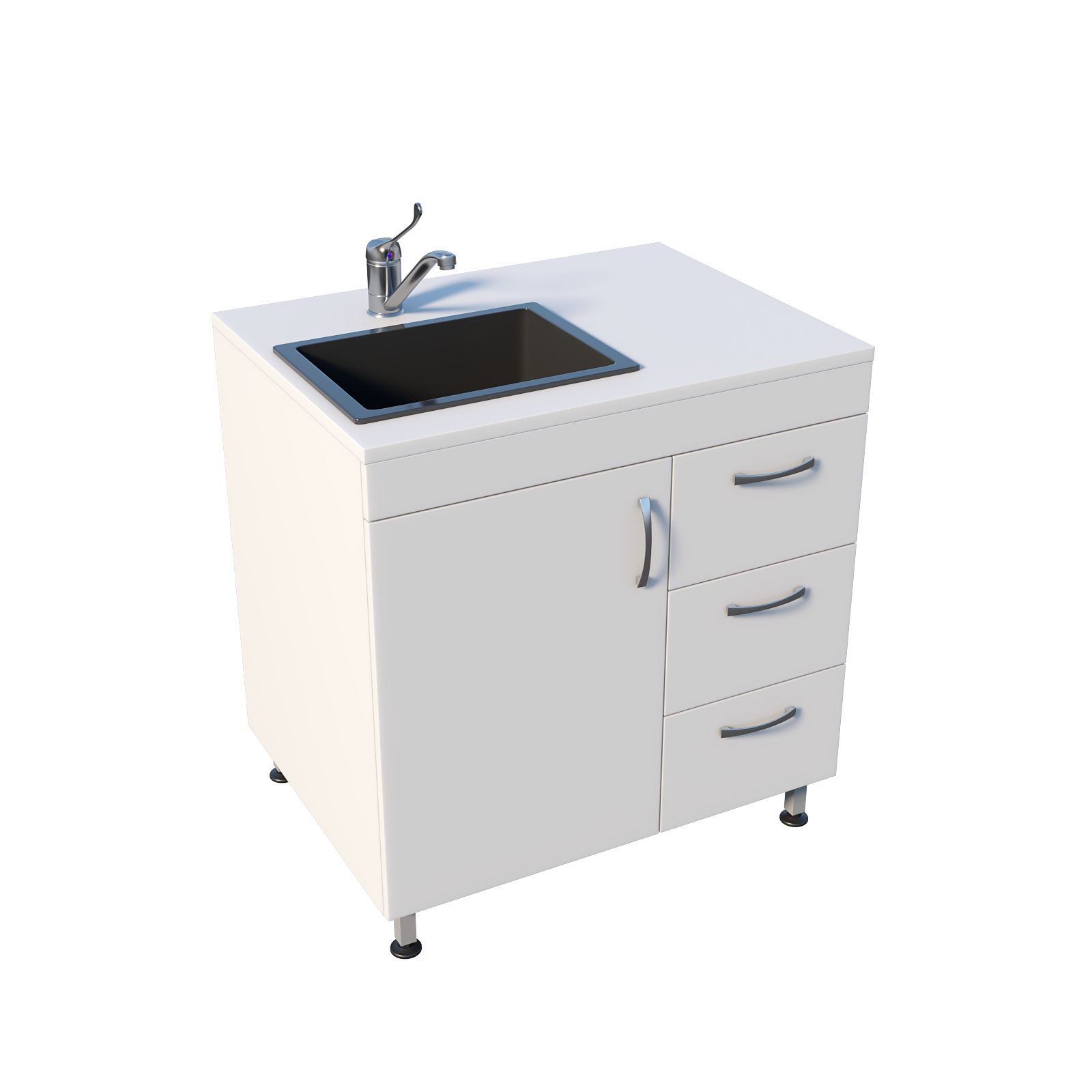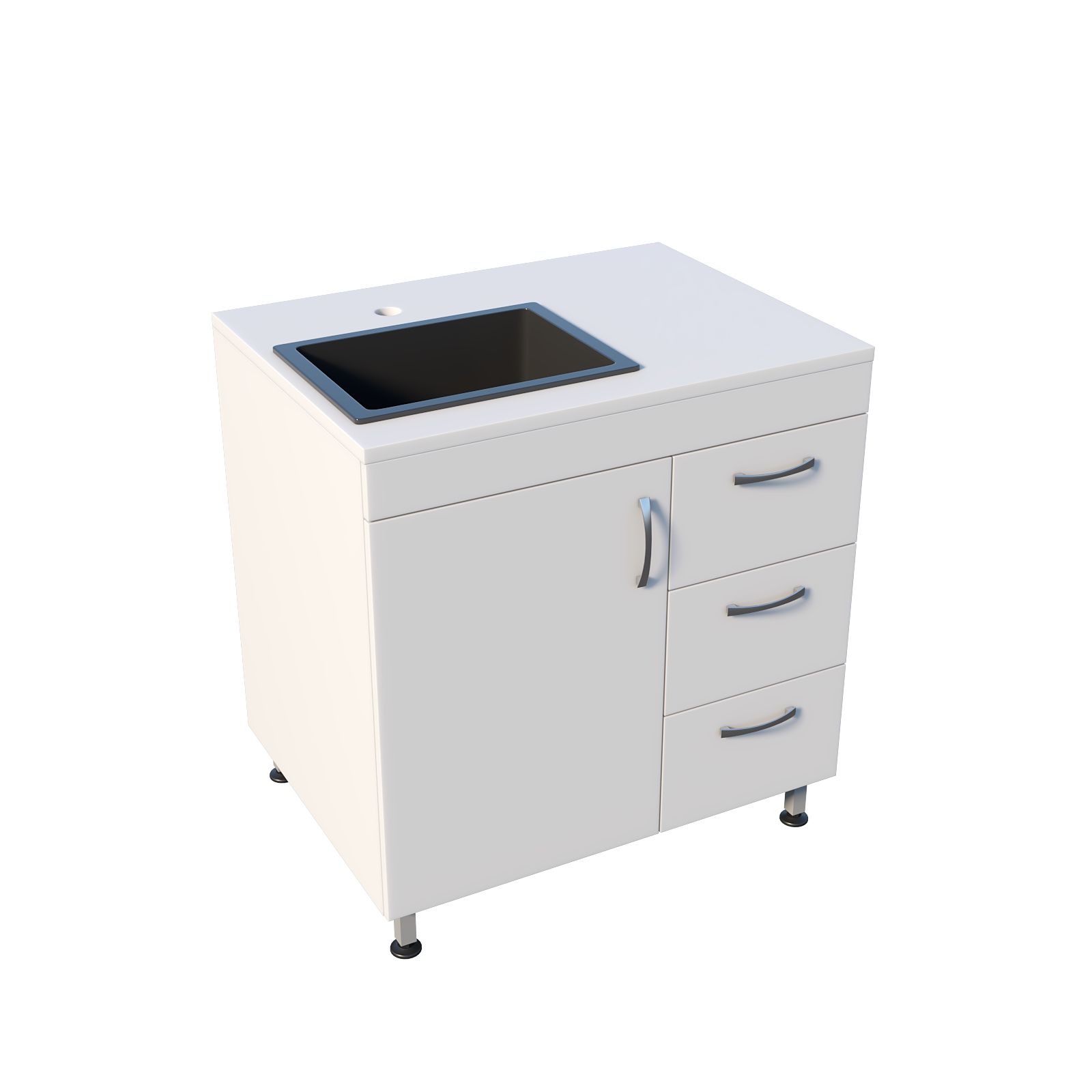 Корпус выполнен из ЛДСП, основание — надежный сварной каркас на ножках, рассчитанный на интенсивную эксплуатацию. Под раковиной предусмотрено закрытое отделение с распашной дверцей, рядом — блок из трех одинаковых выдвижных ящиков для хранения принадлежностей и мелких инструментов. Комплектуется хирургическим локтевым смесителем, что помогает соблюдать требования гигиены и удобнее работать в перчатках.