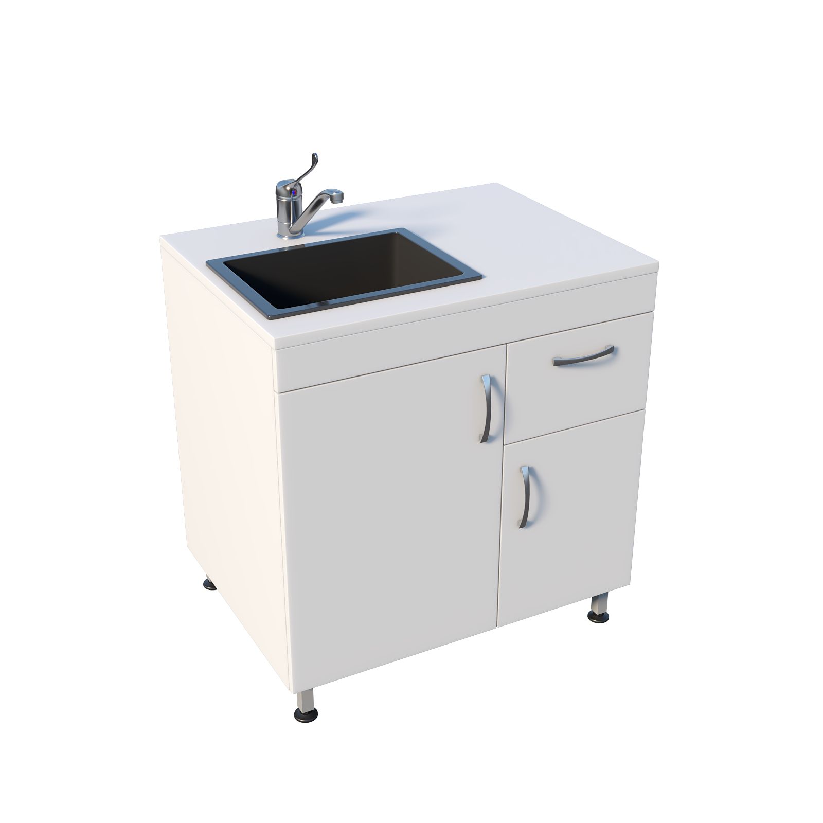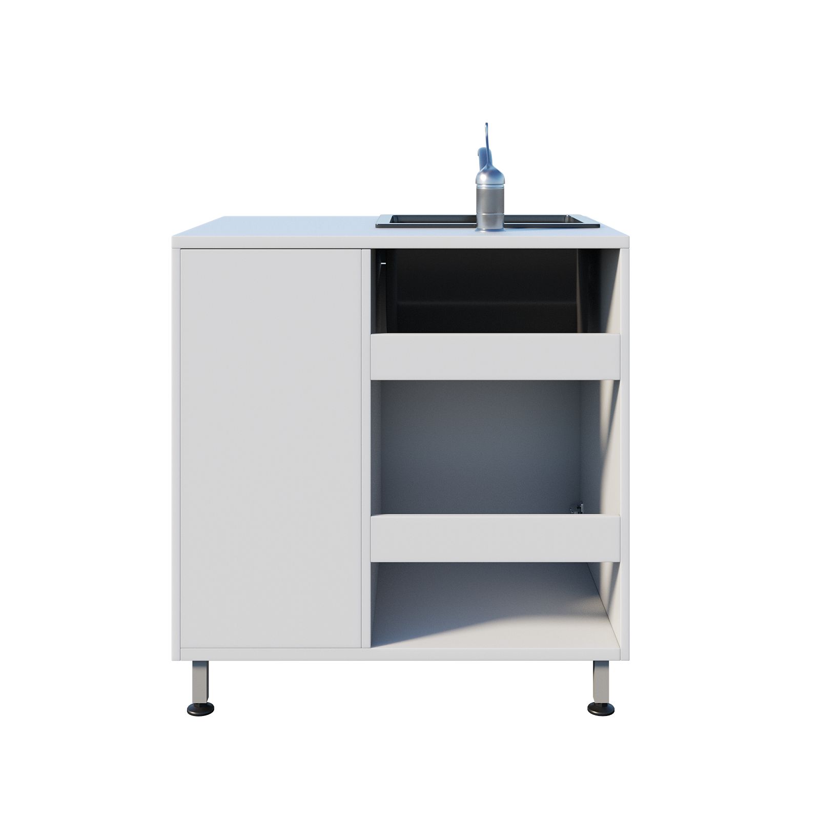 Корпус выполнен из ЛДСП, установлена врезная мойка Stegler. Под раковиной предусмотрено закрытое отделение с распашной дверцей, а по соседству — секция с выдвижным ящиком и дверцей; внутри размещена полка для хранения. Конструкция опирается на ножки в виде сварного каркаса, а хирургический локтевой смеситель позволяет включать воду без лишних касаний, что особенно удобно в медицинской среде.