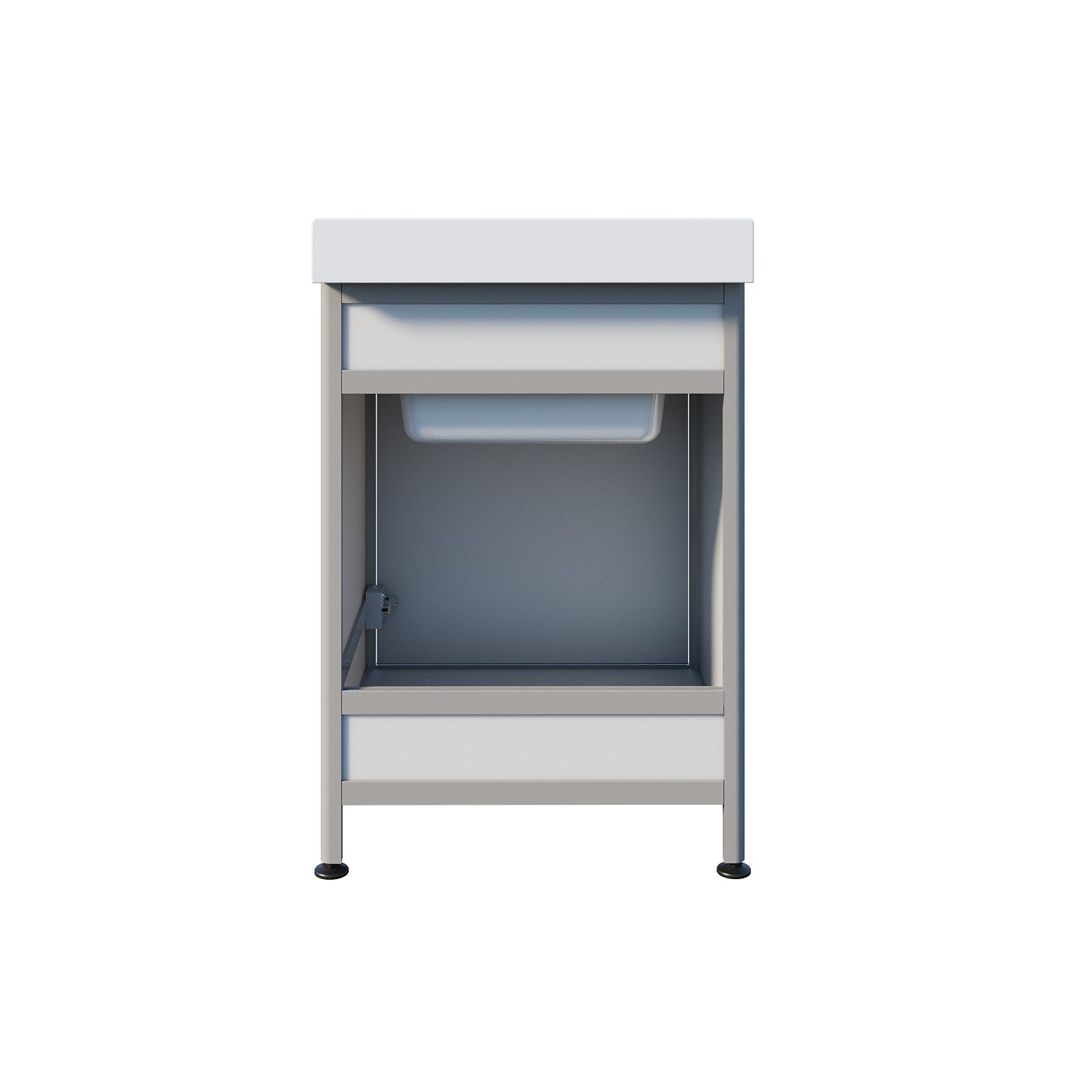 Основание выполнено на каркасе из алюминиевого профиля с заполнением пластиком, который легко переносит типичные условия эксплуатации. Чаша из литьевого мрамора выглядит аккуратно и удобна в уходе. Пространство под мойкой закрывается распашной дверцей — всё необходимое можно хранить рядом и при этом не держать на виду. Ножки являются продолжением алюминиевого профиля, что добавляет устойчивости конструкции. Установлен хирургический локтевой смеситель: включение воды удобно, когда важны гигиена и быстрый доступ во время работы.