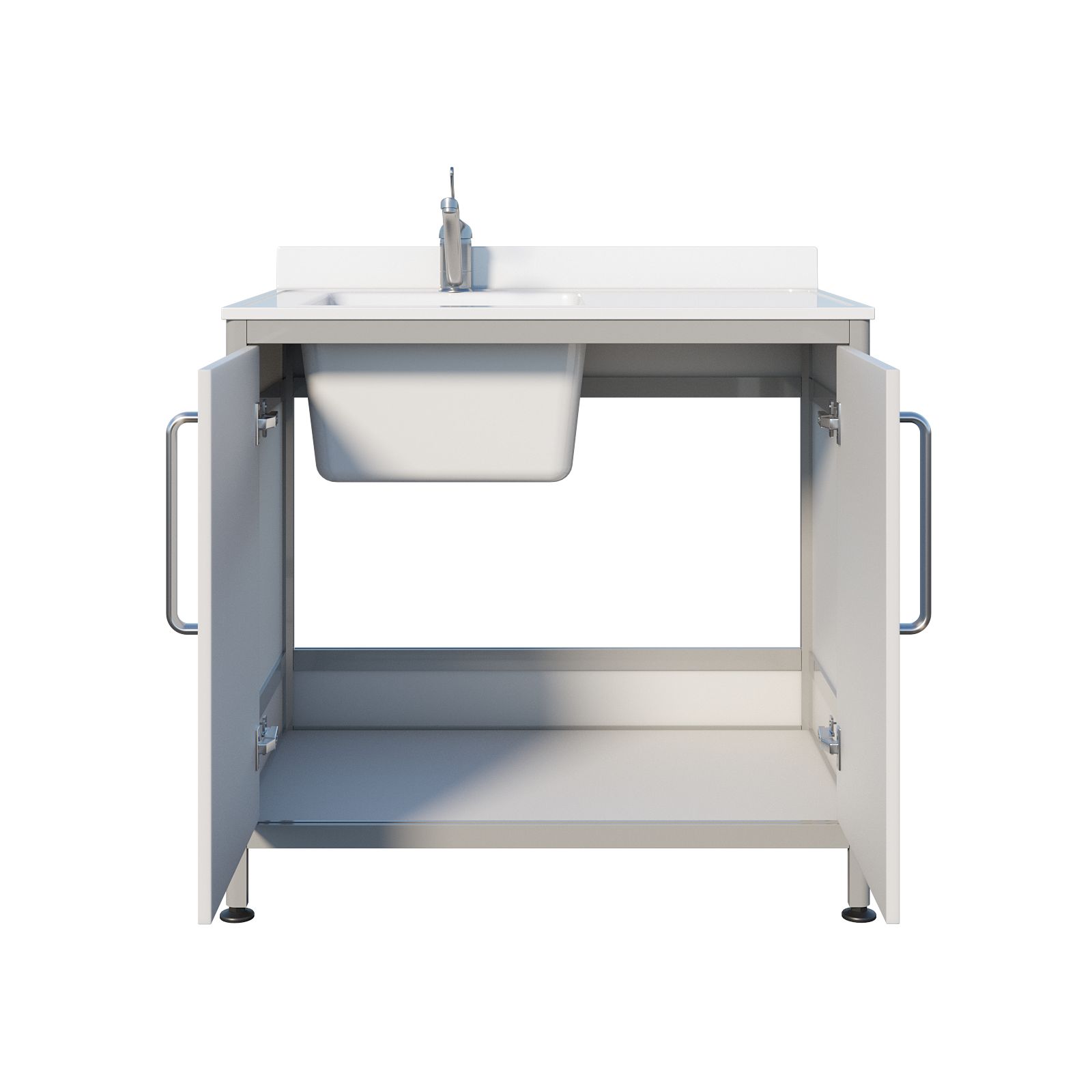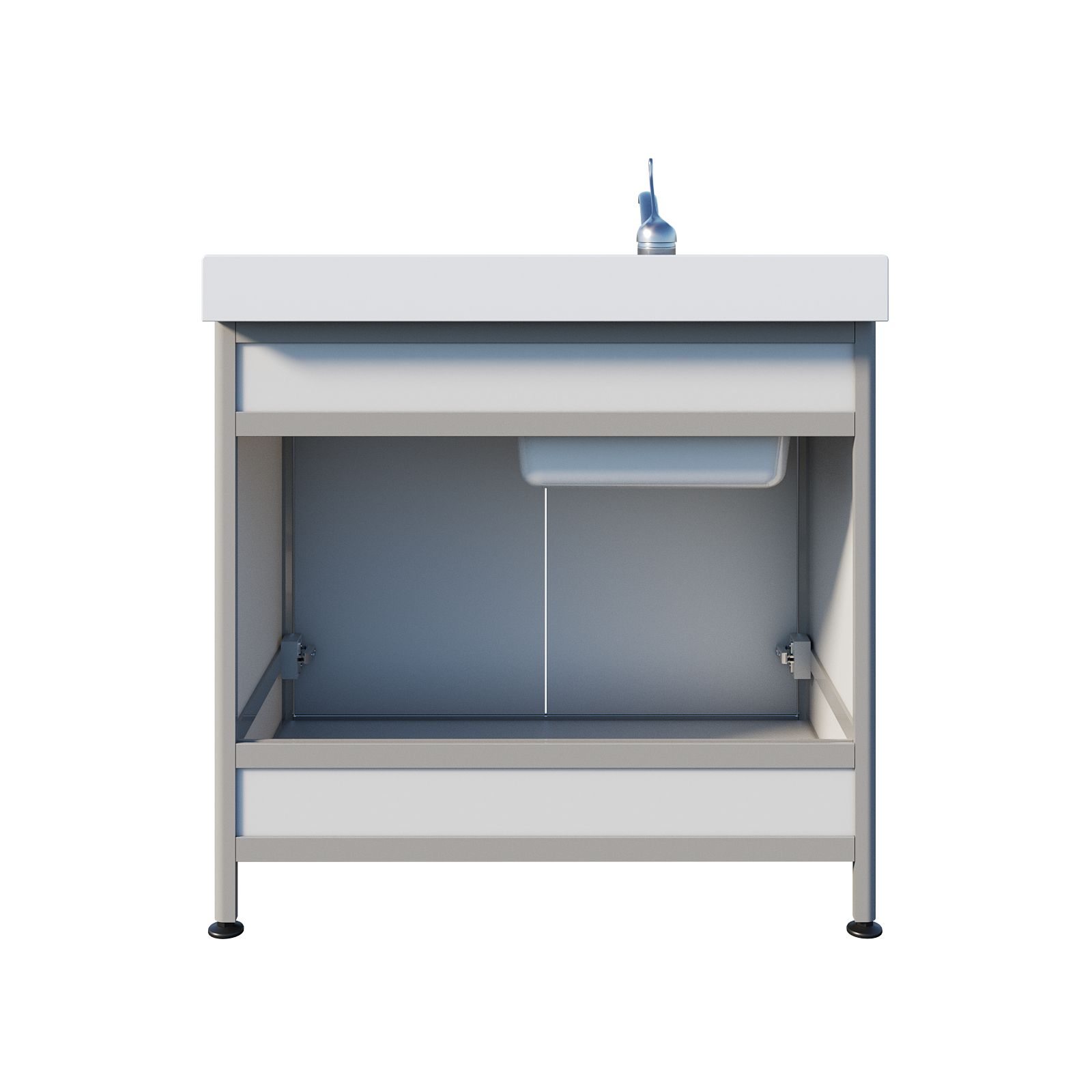 Конструкция выглядит легкой, но по сути это крепкая рабочая станция, рассчитанная на постоянную эксплуатацию. В основе — несущий каркас из алюминиевого профиля с пластиковым заполнением: такое сочетание хорошо подходит для медицинской среды, где оборудование регулярно контактирует с влагой и проходит обработку. Корпус тумбы белого цвета, поэтому мойка выглядит аккуратно и легко вписывается в интерьер кабинета. Тумба закрывается двумя распашными дверцами — внутри удобно хранить расходные материалы, моющие средства и принадлежности, чтобы рабочая зона оставалась свободной.
