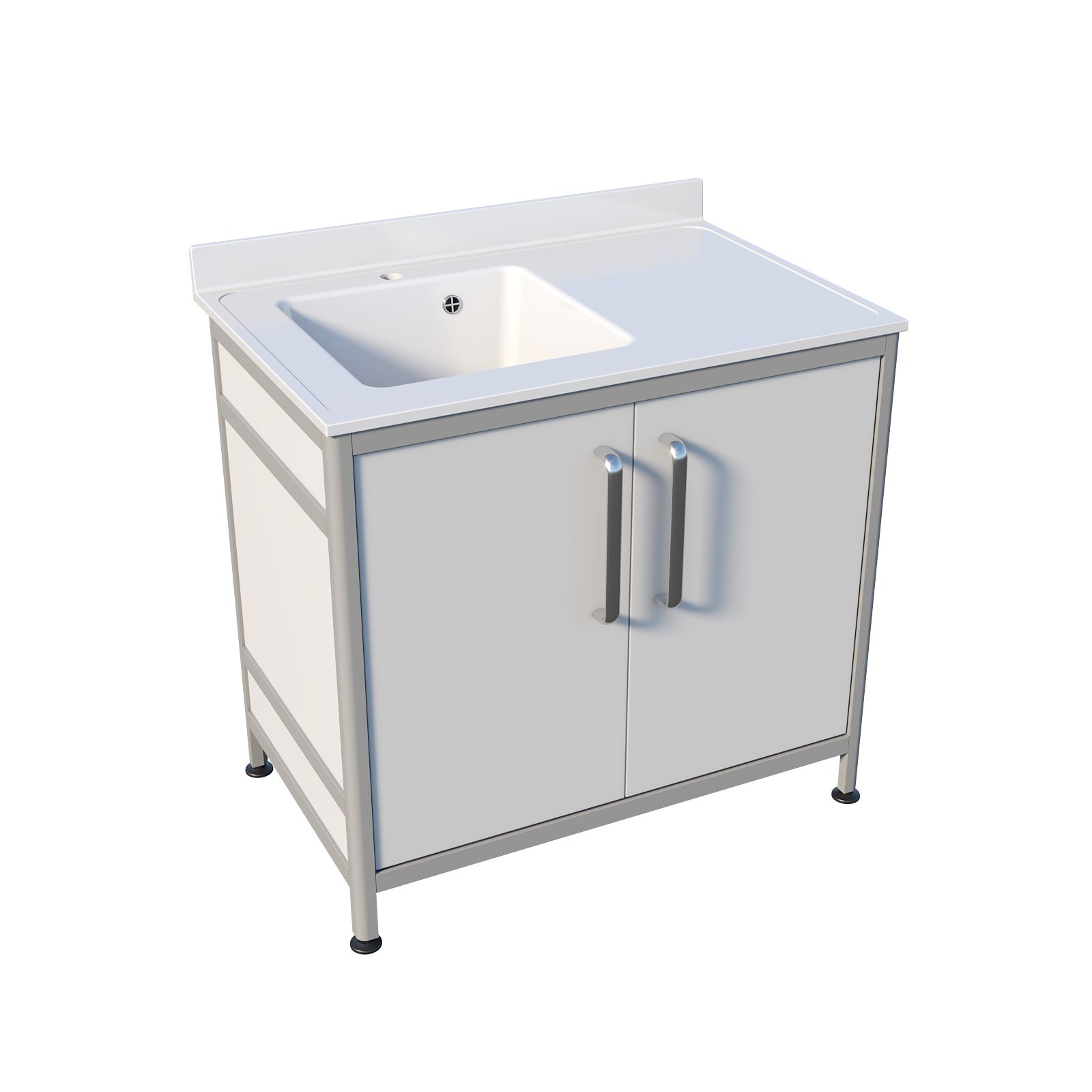 Основа выполнена на каркасе из алюминиевого профиля с заполнением пластиком: конструкция получается лёгкой, аккуратной и устойчивой. Накладная мойка дополнена рабочей поверхностью справа из литьевого мрамора — это удобно, когда нужно разложить принадлежности или подготовить инструменты перед обработкой. Корпус тумбы из пластика закрывается двумя распашными дверцами, а ножки являются продолжением алюминиевого профиля, что добавляет жёсткости и визуальной цельности. Для комфортной работы предусмотрен хирургический локтевой смеситель.