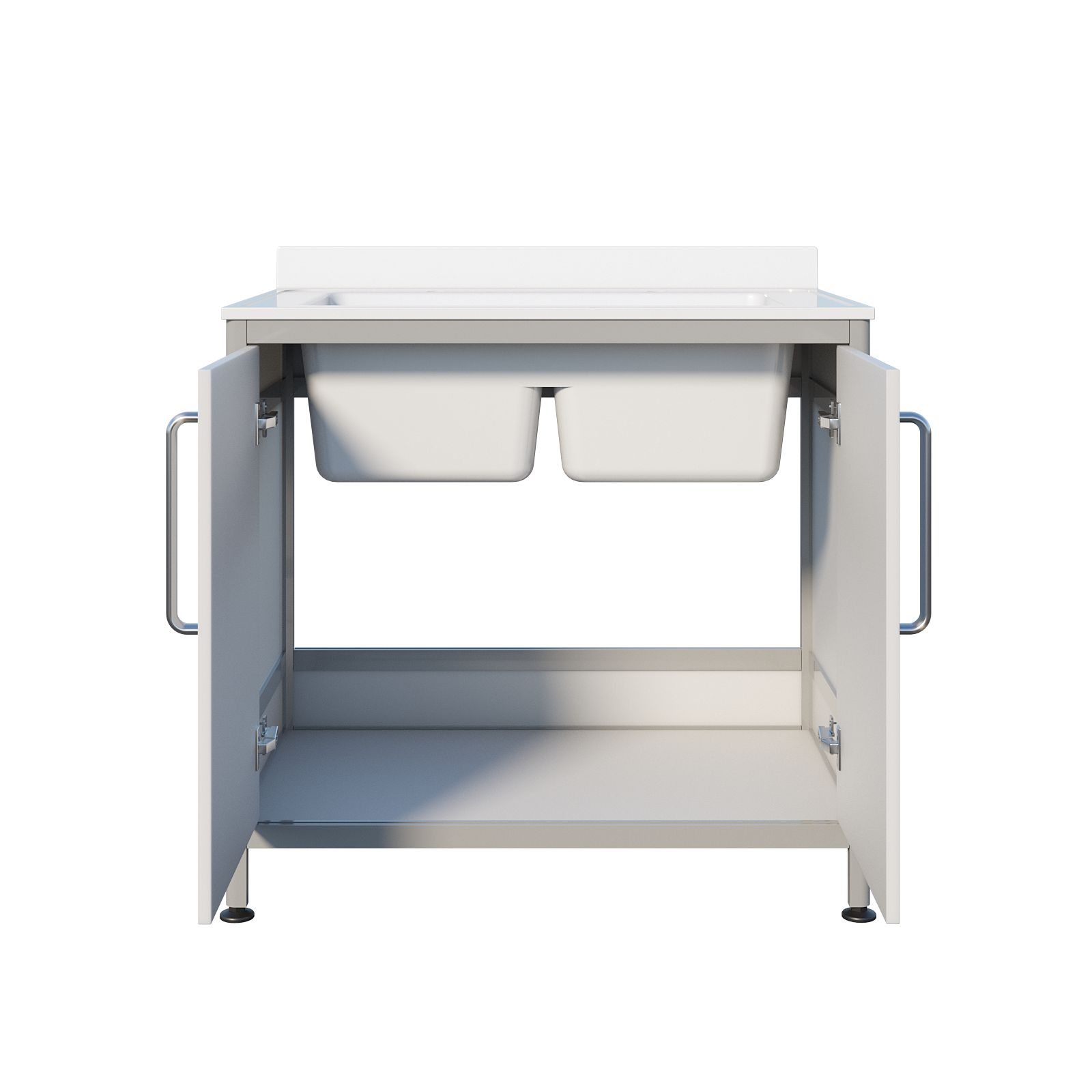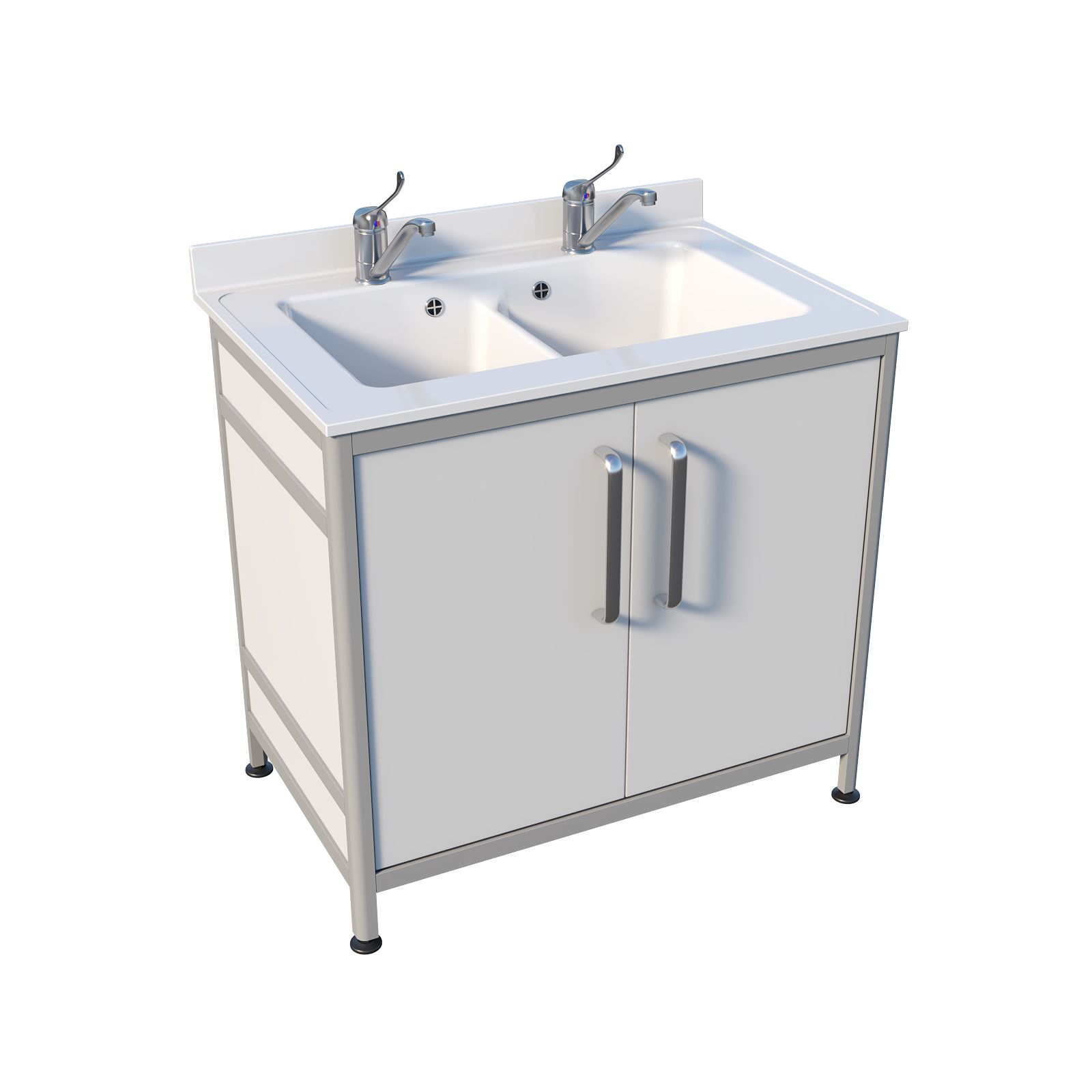 Основа конструкции выполнена из алюминиевого профиля, а белое пластиковое заполнение делает изделие визуально «чистым» и аккуратным. Накладная двухчашевая мойка из литьевого мрамора удобна, когда нужно разделить процессы: например, ополаскивание и основное мытьё или работу с разными типами принадлежностей. Тумба закрывается двумя распашными дверцами, а ножки являются продолжением алюминиевого профиля, благодаря чему конструкция выглядит цельно и устойчиво. Над каждой чашей установлен хирургический локтевой смеситель — удобно, когда руки заняты.