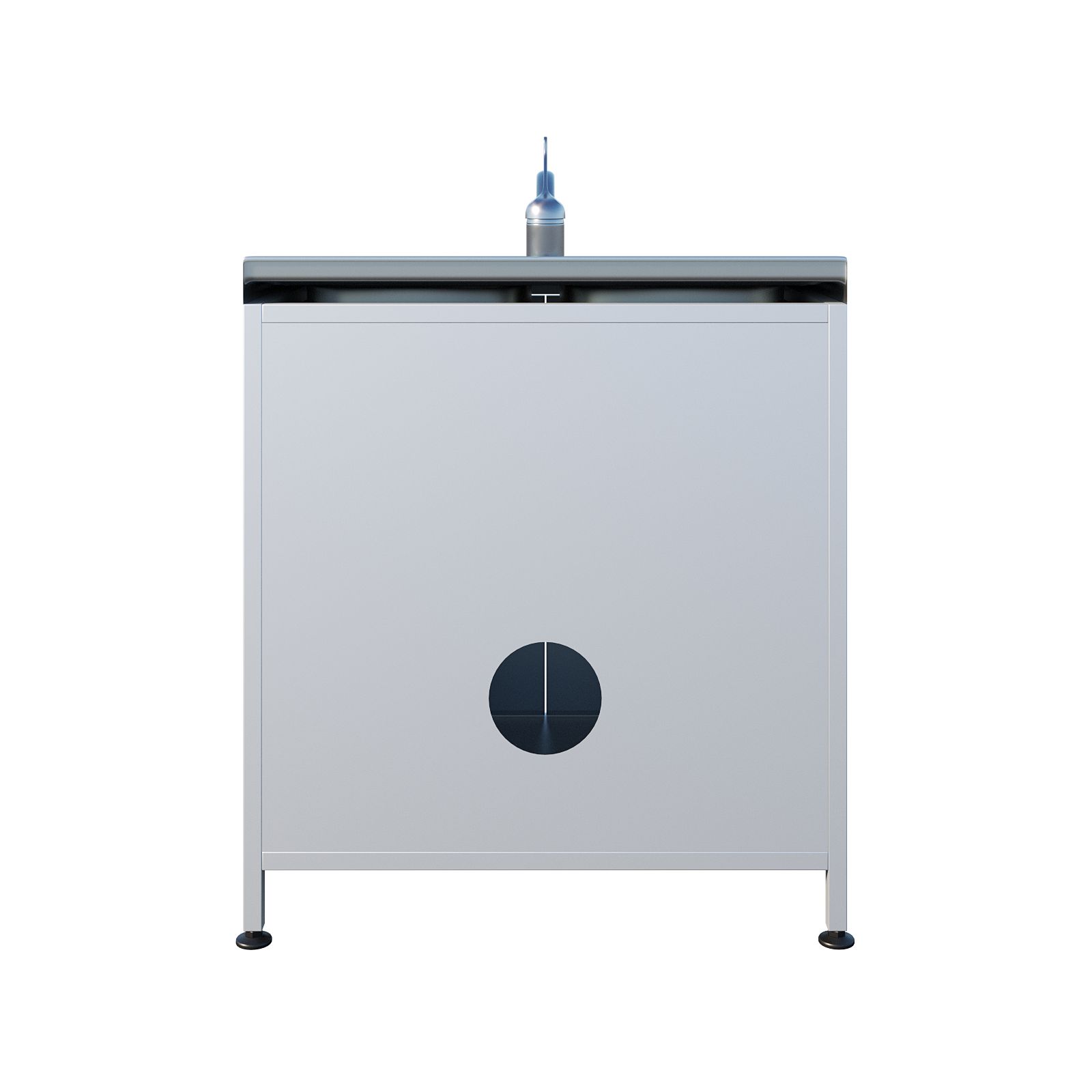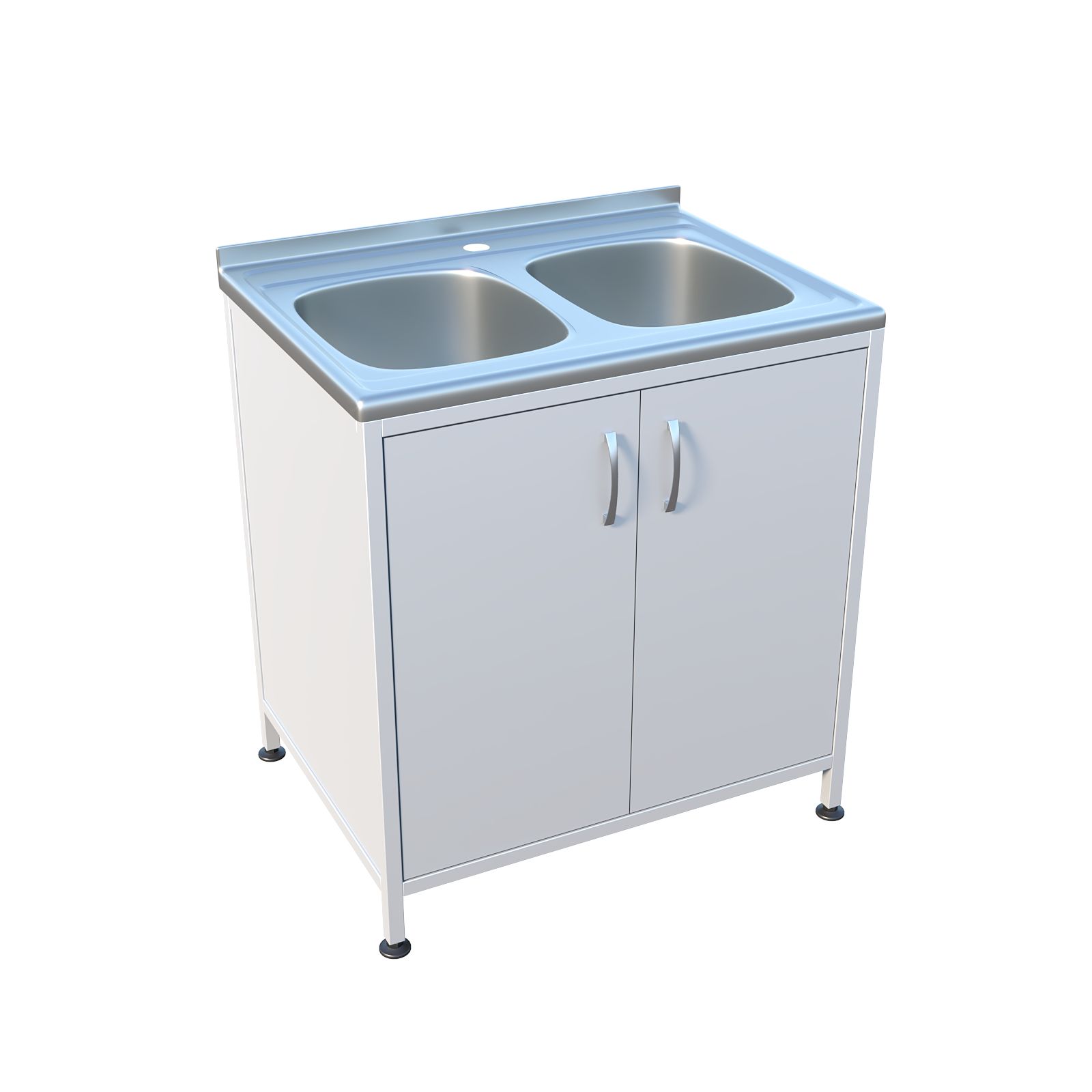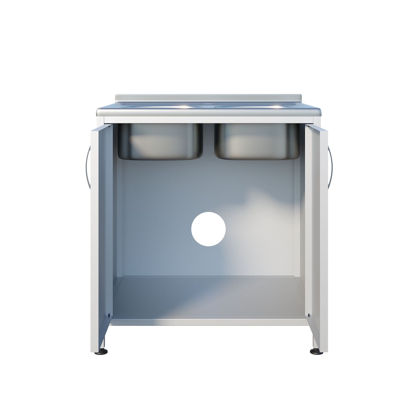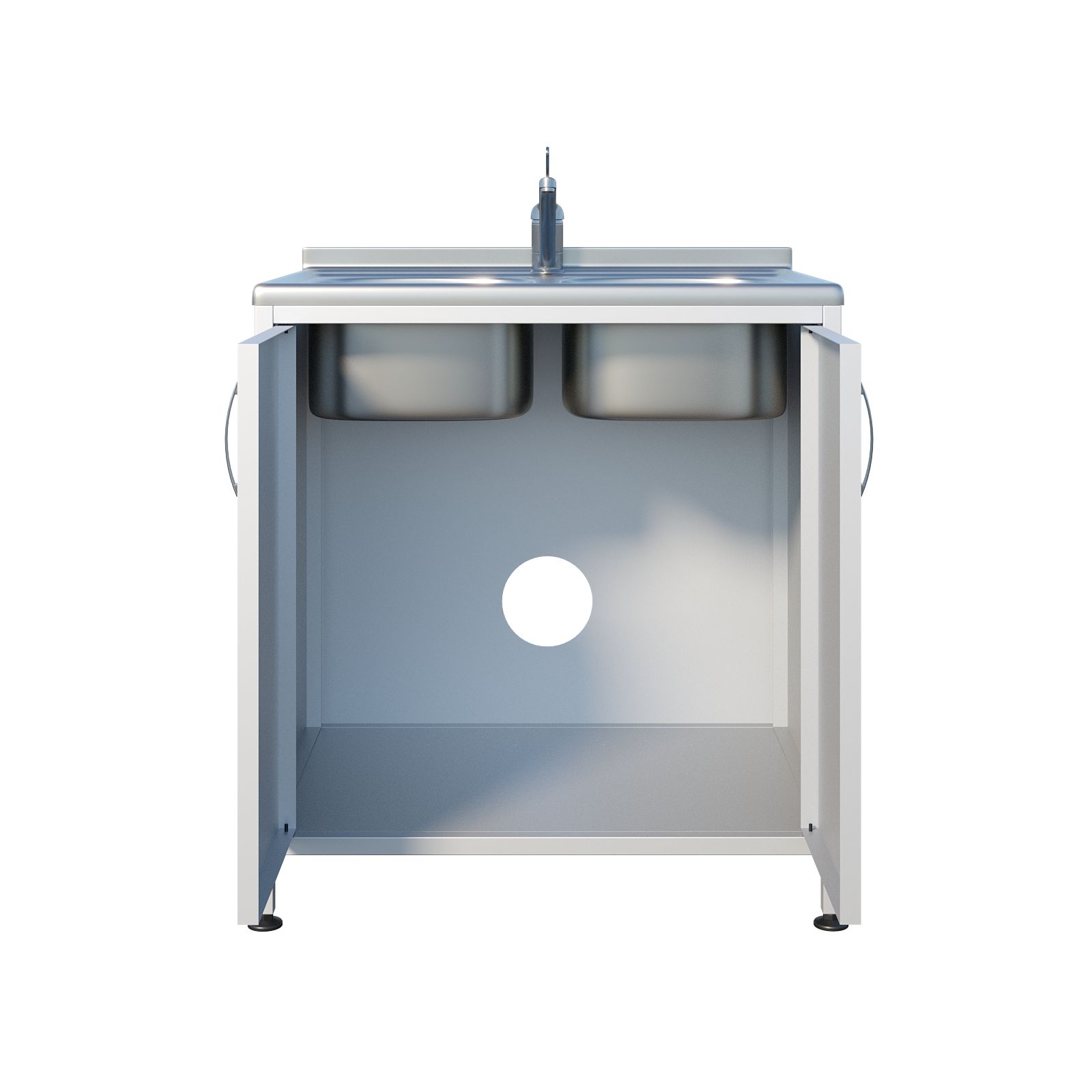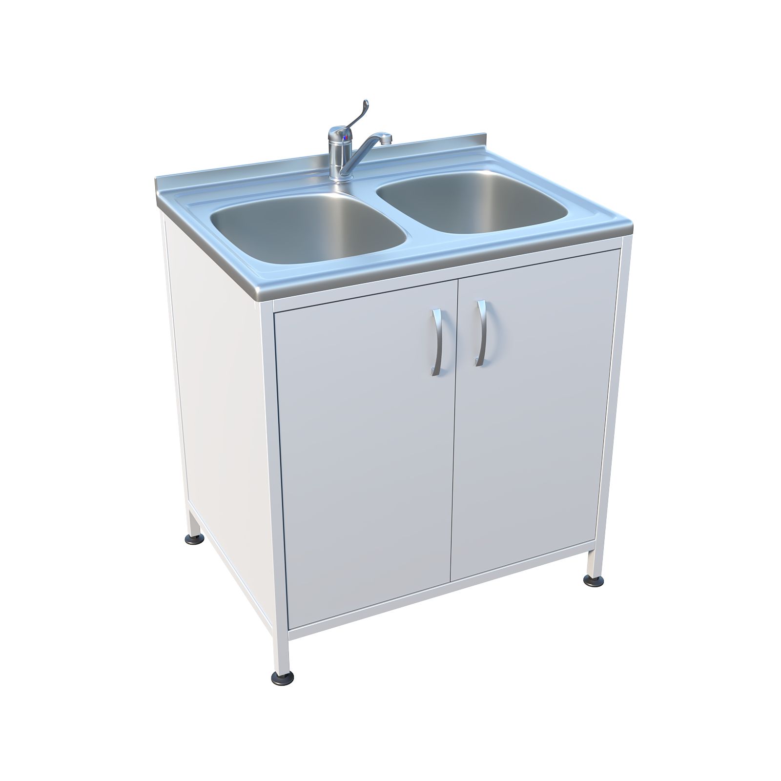 Основа конструкции — прочный металлический каркас и корпус тумбы с белым порошковым покрытием: поверхность практичная, аккуратно выглядит и рассчитана на ежедневную нагрузку. Сверху установлена накладная двухчашевая мойка из нержавеющей стали — удобно разделять процессы и поддерживать порядок на рабочем месте. Под мойкой предусмотрено отделение с распашными дверцами для хранения расходников и принадлежностей. В комплекте — хирургический локтевой смеситель, позволяющий управлять водой максимально гигиенично. Регулируемые по высоте опоры помогают выставить мойку ровно даже при неровностях пола.