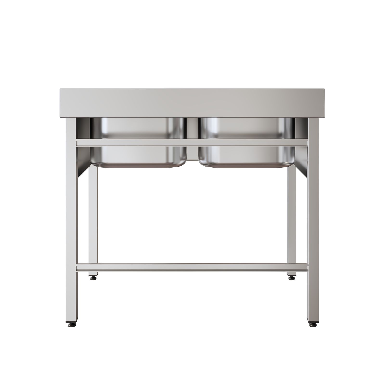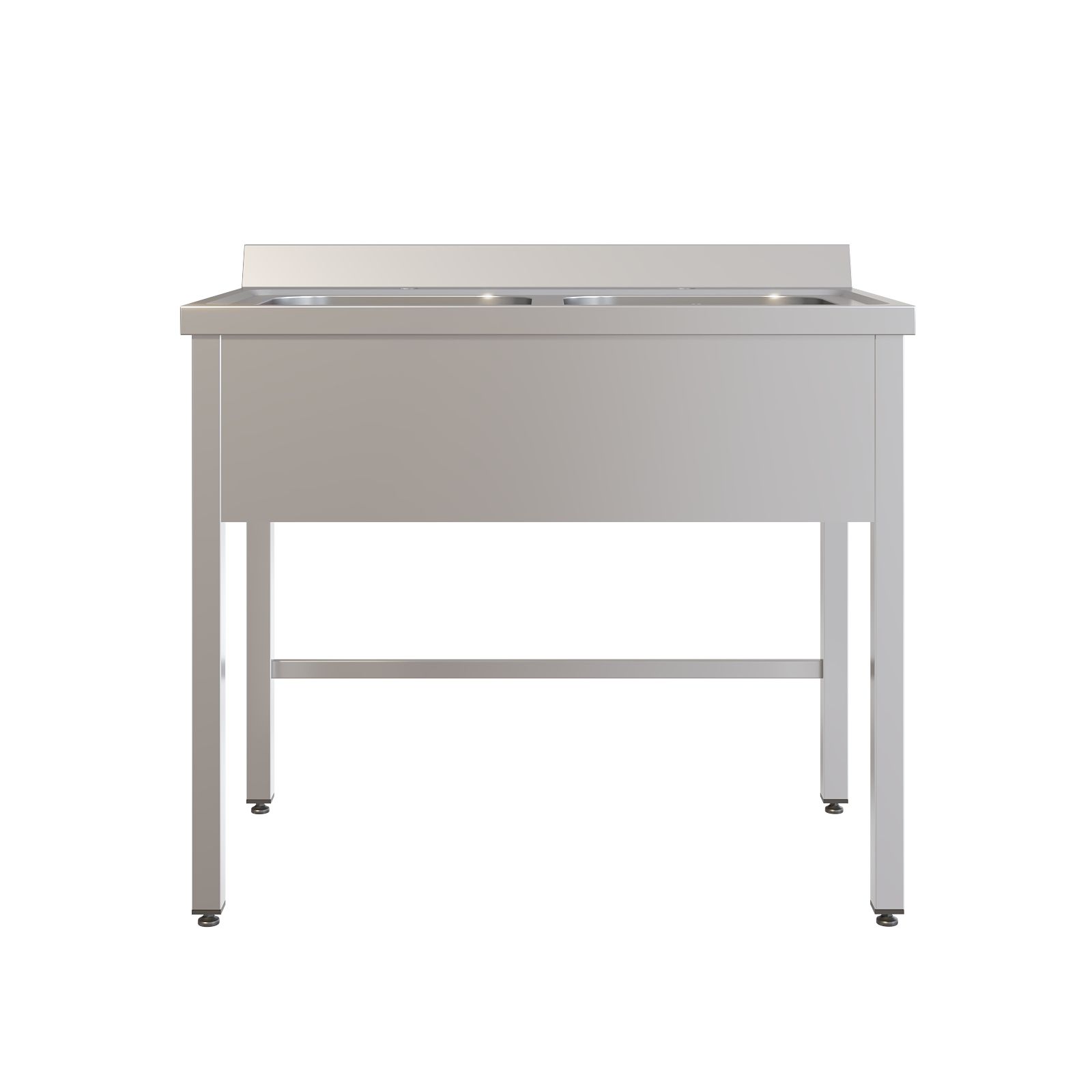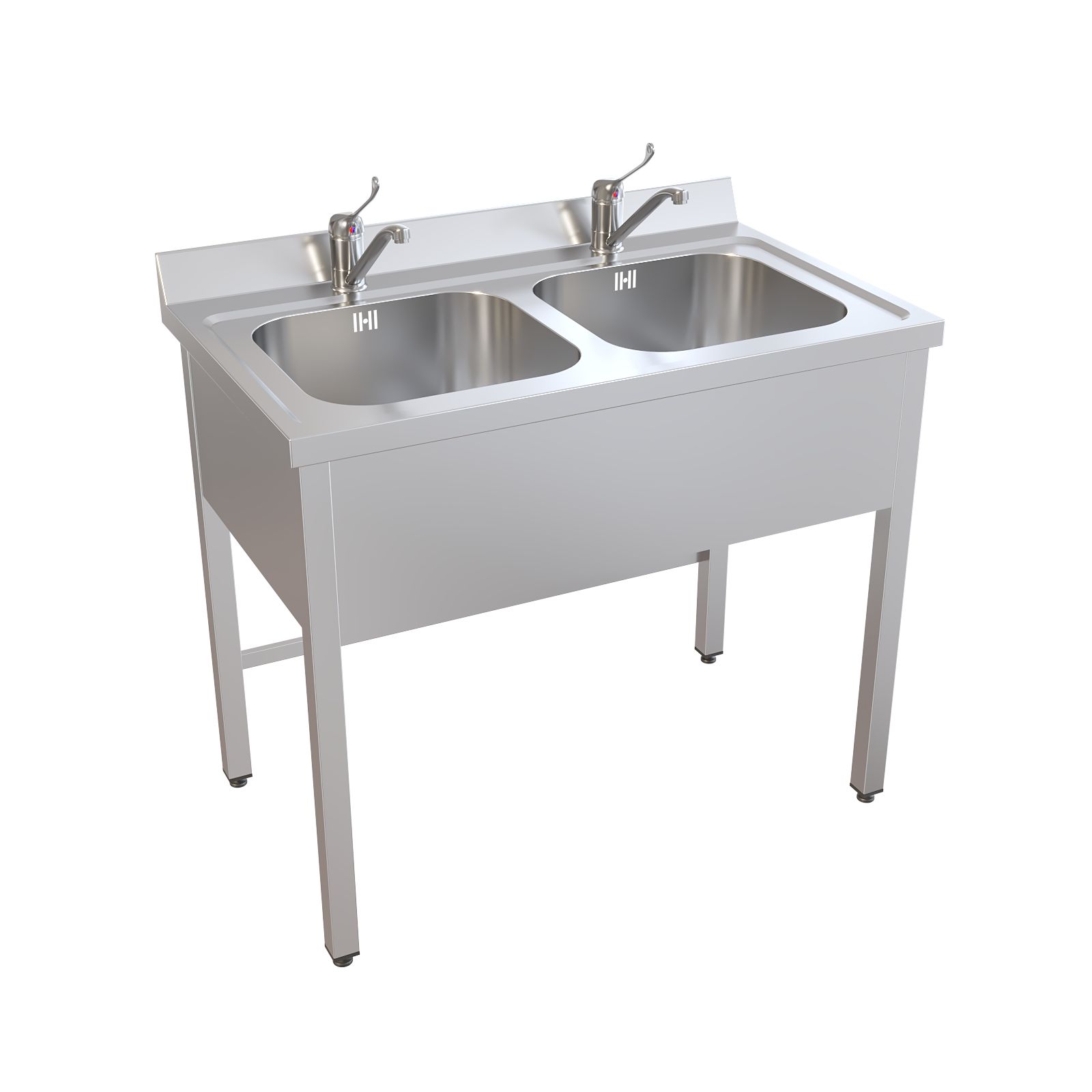 Конструкция полностью выполнена из нержавеющей стали AISI 304: прочный каркас из сварной трубы, двухчашевая раковина с пристеночным бортом, а также фартук с трёх сторон. С тыльной стороны предусмотрены две перемычки для дополнительной жёсткости, поэтому мойка уверенно держит нагрузку и сохраняет геометрию при активной эксплуатации. Для комфортной работы установлен хирургический локтевой смеситель над каждой чашей, а регулируемые по высоте опоры помогают точно выставить мойку по месту, даже если пол имеет небольшие перепады.