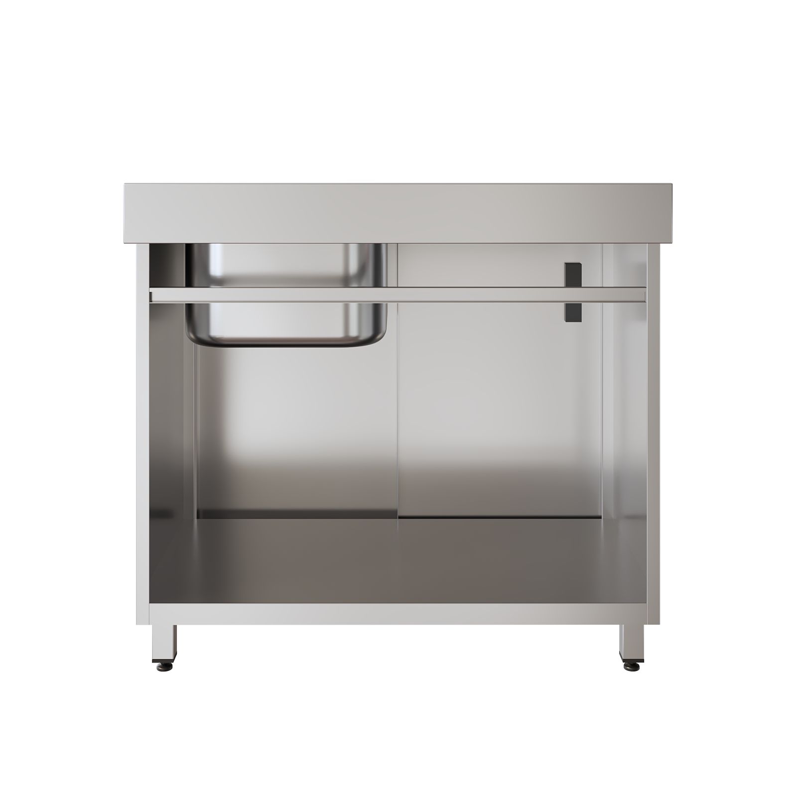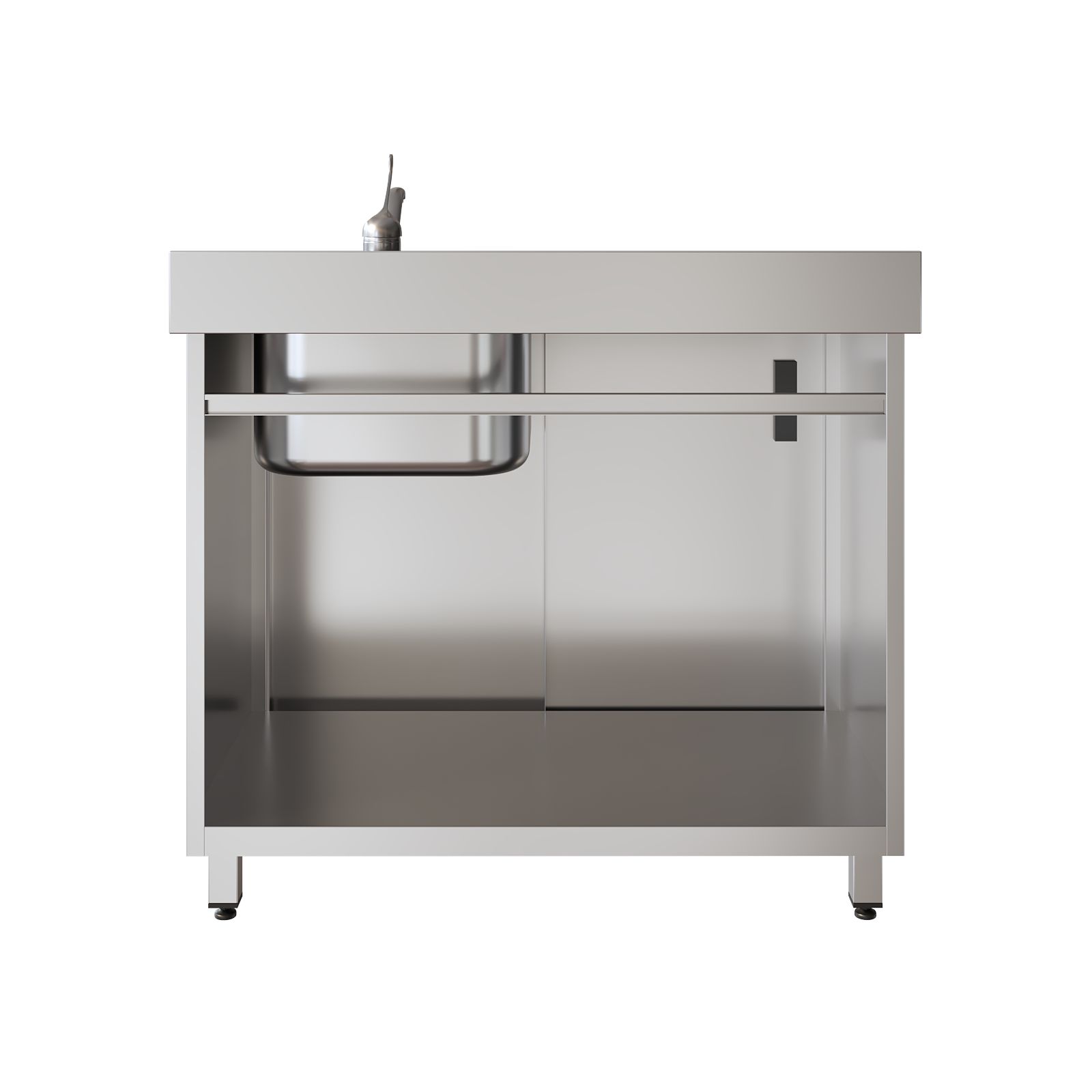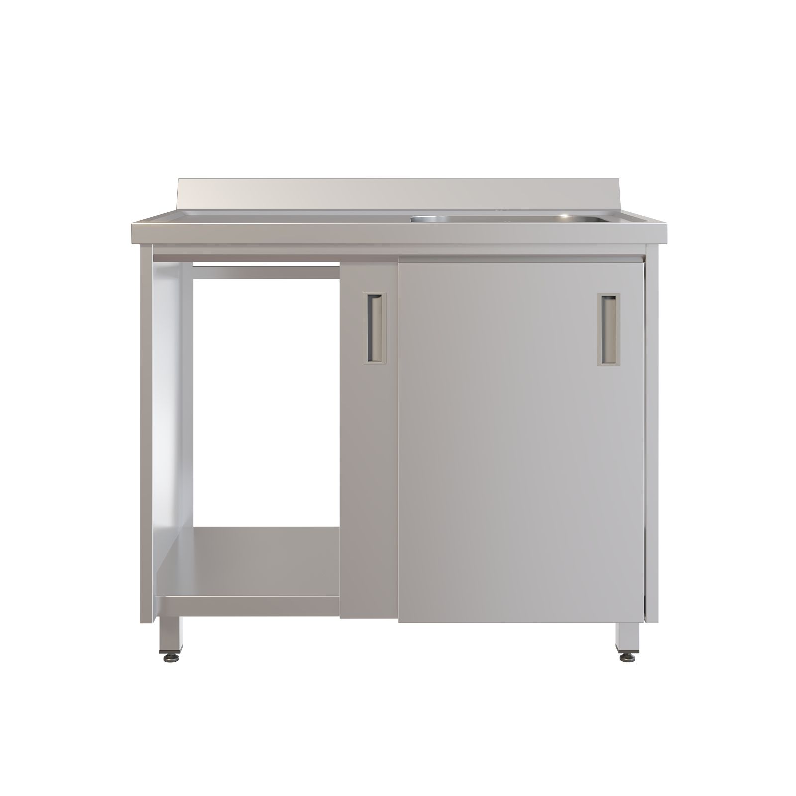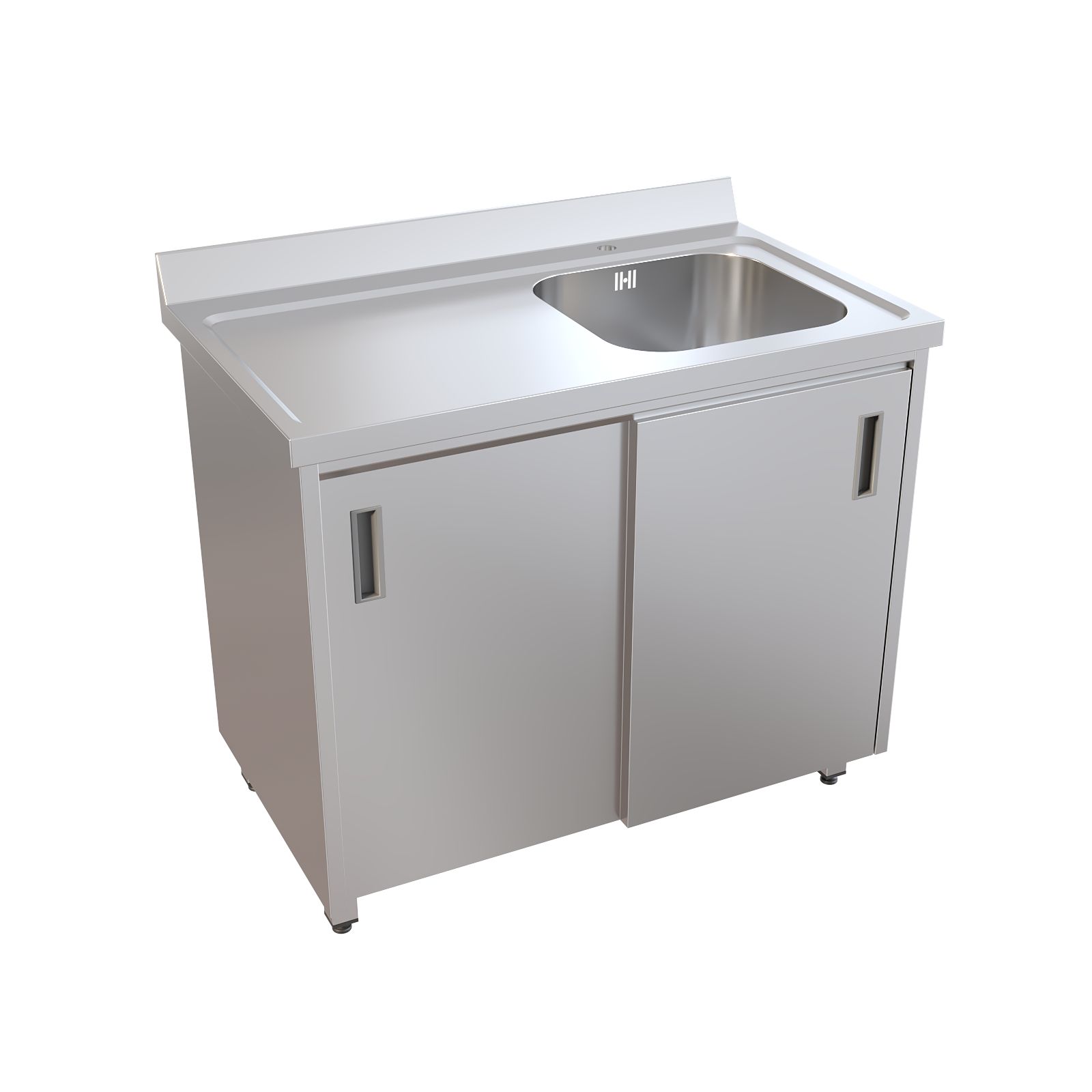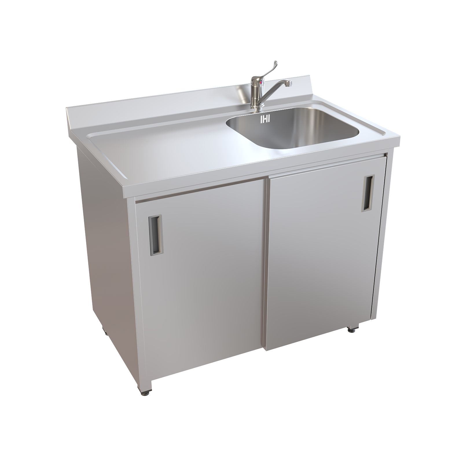 Мойка полностью выполнена из нержавеющей стали AISI 304. Одночашевая раковина дополнена удобной рабочей поверхностью слева и пристеночным бортом, который помогает защитить стену и рабочую зону от брызг. Под моечной зоной предусмотрено отделение с раздвижными дверями-купе — всё необходимое можно держать под рукой, не загромождая помещение. Установлен хирургический локтевой смеситель, а регулируемые по высоте опоры позволяют точно выставить мойку по уровню.