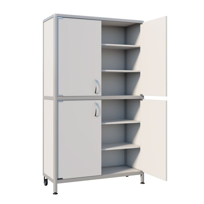 Шкаф состоит из двух секций, каждая из которых закрывается двумя распашными дверями и оснащена двумя полками для рационального размещения содержимого. Конструкция установлена на две регулируемые по высоте опоры и дополнительно оснащена двумя колесными опорами для удобства перемещения.