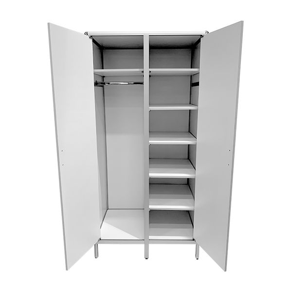 Шкаф СТР МД-ал 108.04 оснащен полками и штангой для вешалок, что позволяет эффективно организовать хранение и дать удобный доступ к различным элементам одежды. Каркас из алюминиевого профиля обеспечивает прочность и жесткость конструкции, а порошковое покрытие каркаса защищает его от негативного воздействия окружающей среды.