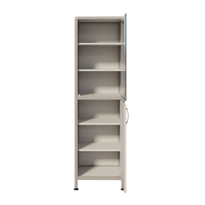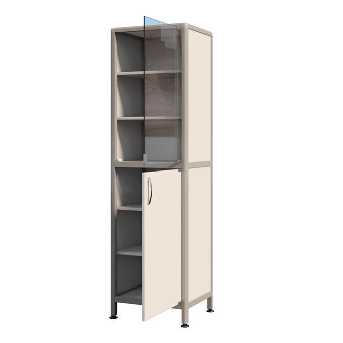 Регулируемая высота ножек обеспечивает устойчивое положение шкафа даже на неровных поверхностях, а порошковое покрытие алюминиевого профиля каркаса защищает его от повреждений и обеспечивает эстетичный внешний вид. Декоративный профиль на углах шкафа придает ему особый шарм, а разделенная на отделения ниша позволяет организовать сохранение материалов и предметов в порядке.