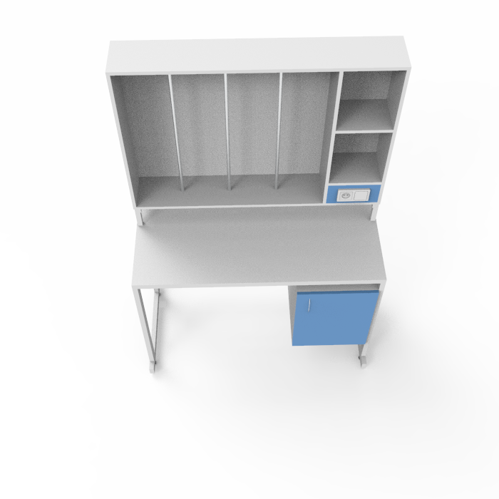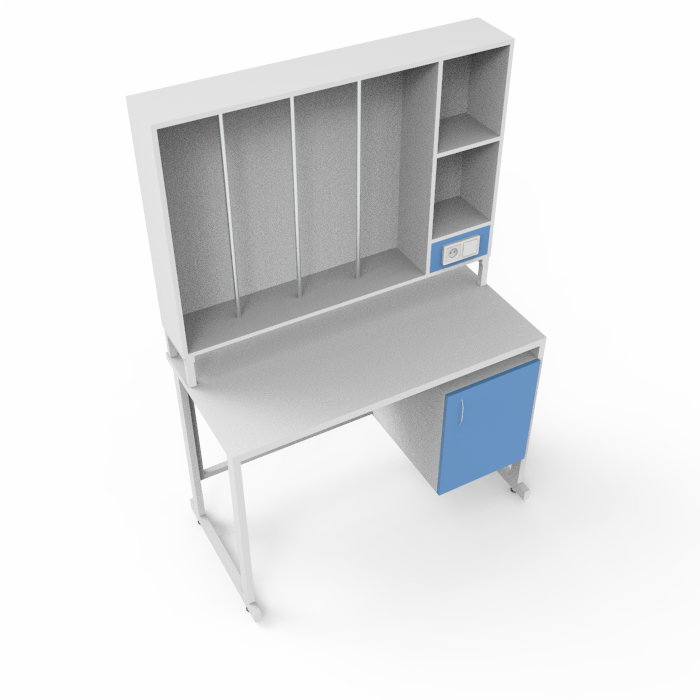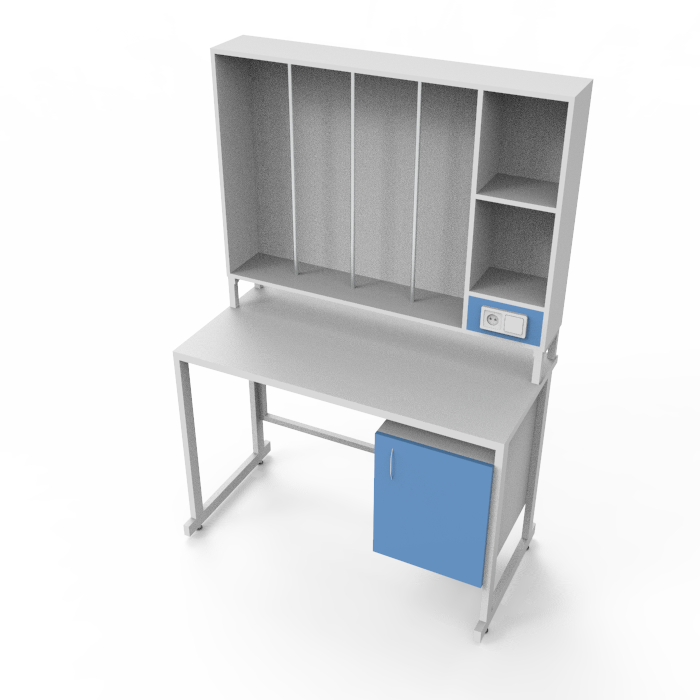 Стол и столешница выполнены из качественного ЛДСП, а каркас изготовлен из прочного стального профиля с порошковым покрытием, что придает конструкции надежность, стабильность и долговечность. Основные особенности данной модели включают возможность удобного размещения исследуемых образцов и других предметов на надстройке, обеспечивая эффективность и организованность рабочего процесса.