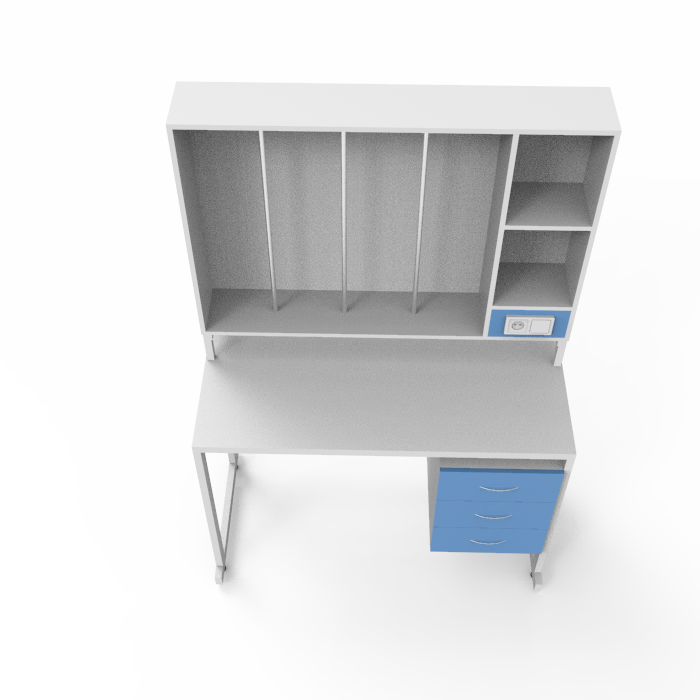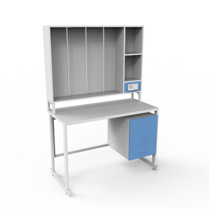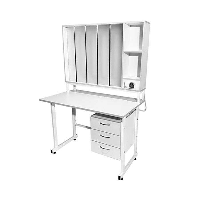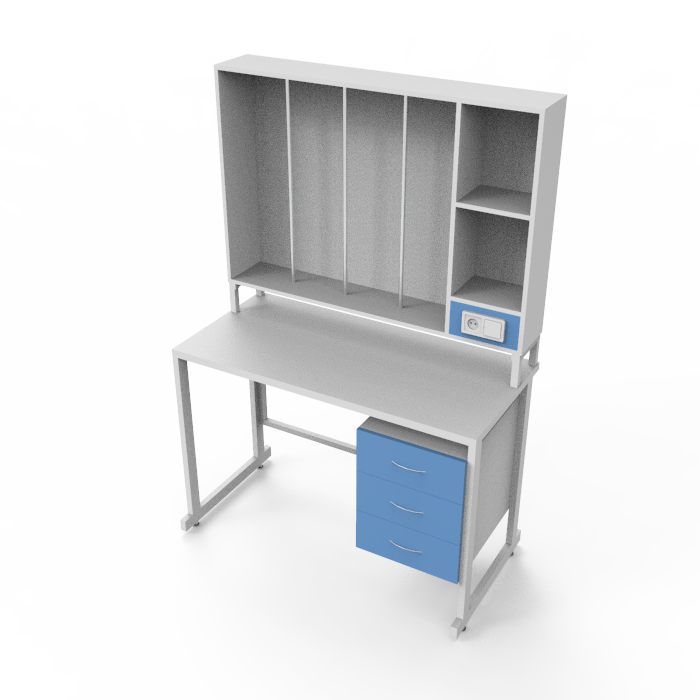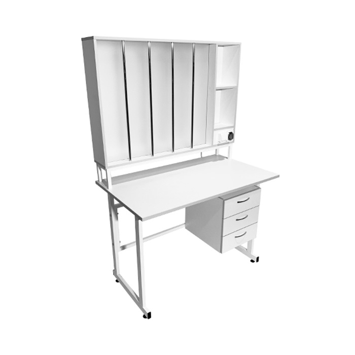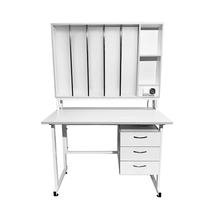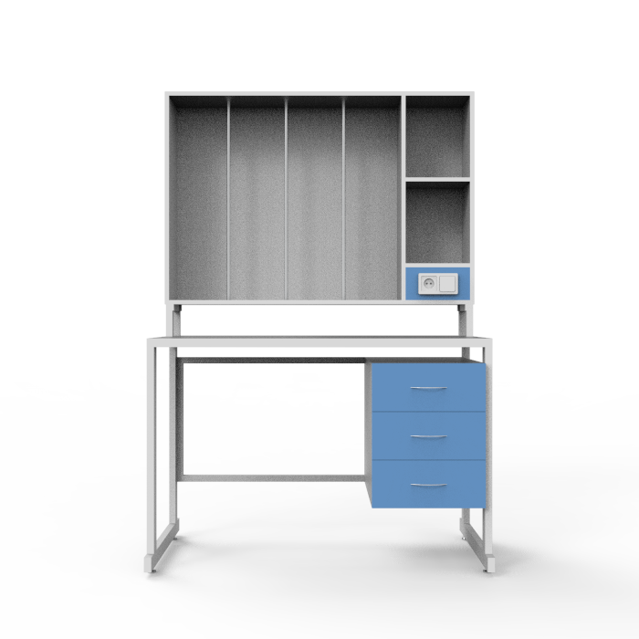 Стол оснащен надстройкой, которая предназначена для удобного размещения исследуемых образцов и других предметов. Надстройка оборудована светильником с выключателем и розеткой, что обеспечивает дополнительное освещение и удобство при работе. Боковая тумба стола имеет 3 выдвижных ящика для хранения различных материалов и инструментов. Регулируемые по высоте ножки с винтовыми опорами-регуляторами позволяют установить стол на ровной и неровной поверхности.