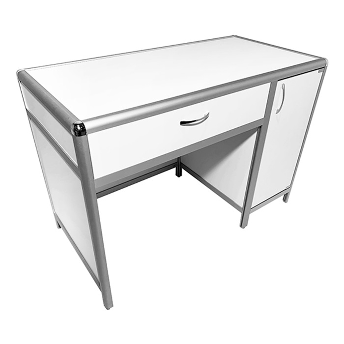 Каркас стола выполнен из высококачественного алюминиевого профиля, обеспечивая прочность и устойчивость конструкции. Отличительной чертой этой модели является наличие выдвижного ящика и боковой тумбы с распашной дверцей и полкой, что обеспечивает дополнительное пространство для хранения необходимых материалов и инструментов.