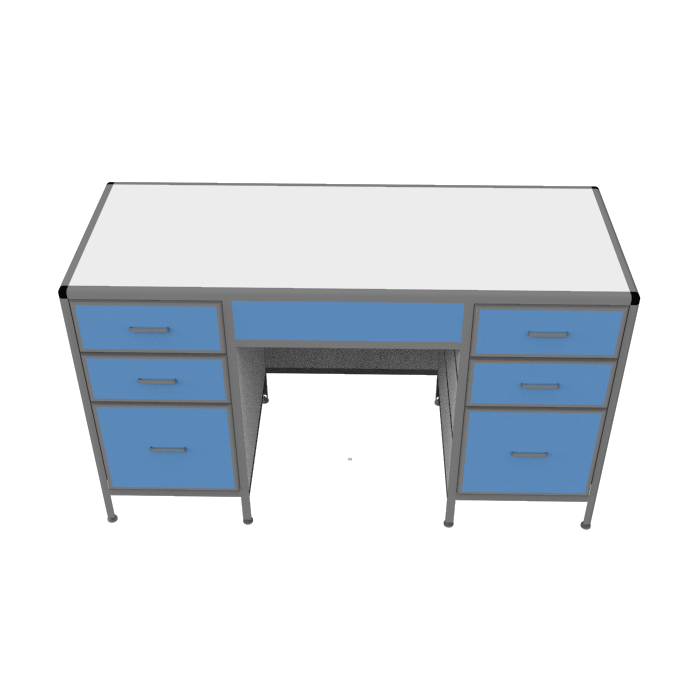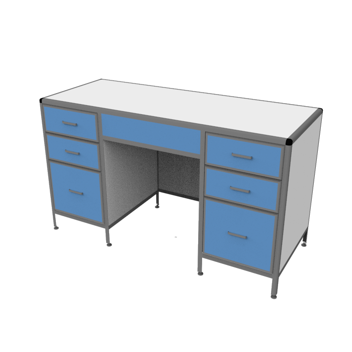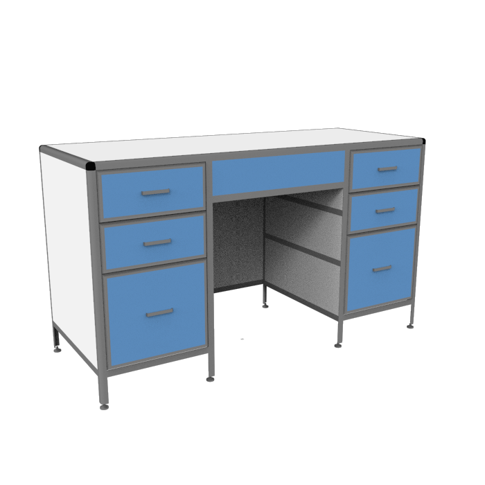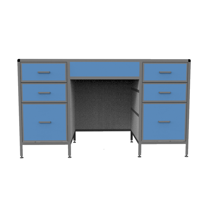 Для удобства хранения различных материалов, в столе предусмотрено несколько выдвижных ящиков различного размера и конфигурации. Регулируемые по высоте опоры стола позволяют компенсировать неровности напольного покрытия и обеспечивают стабильность конструкции.