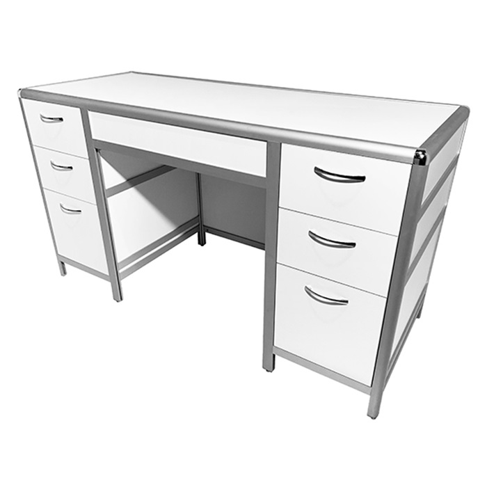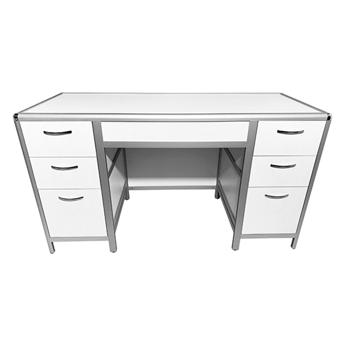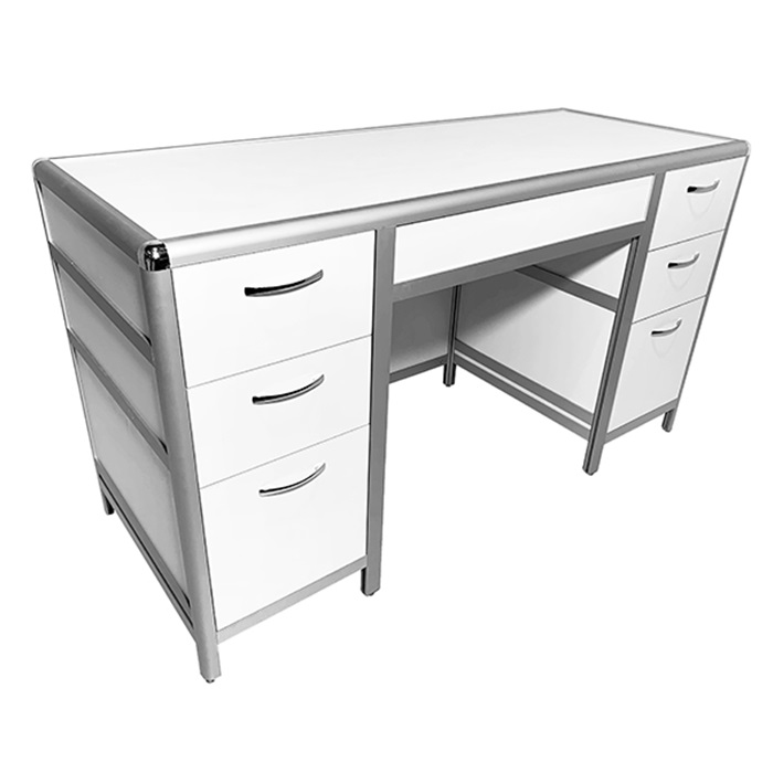 Каркас стола изготовлен из прочного алюминиевого профиля, обеспечивая надежность и долговечность конструкции. В данной модели стола предусмотрены две боковые тумбы, каждая из которых оснащена тремя выдвижными ящиками, что обеспечивает дополнительное пространство для хранения материалов и инструментов.