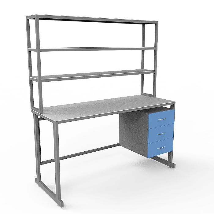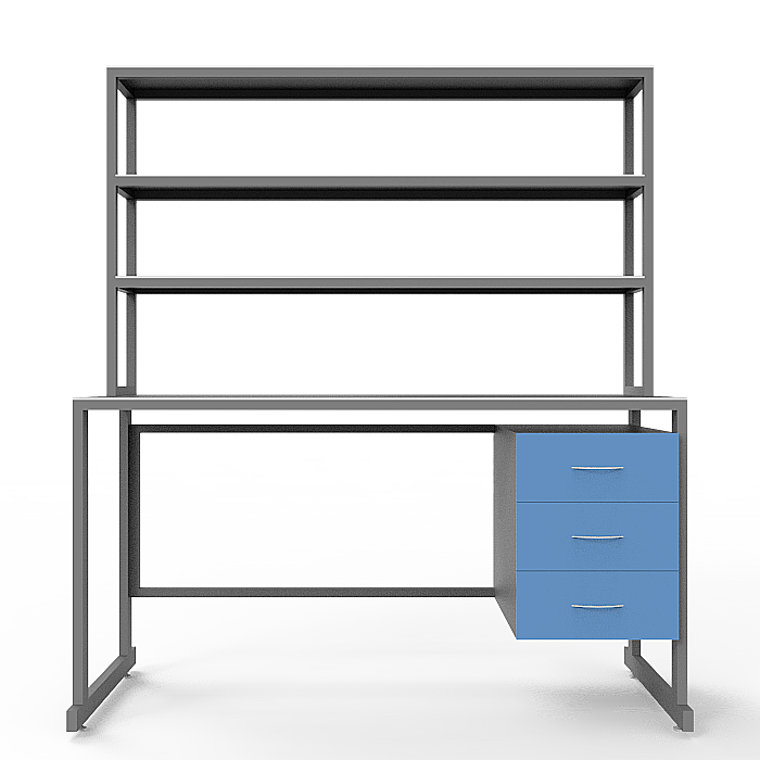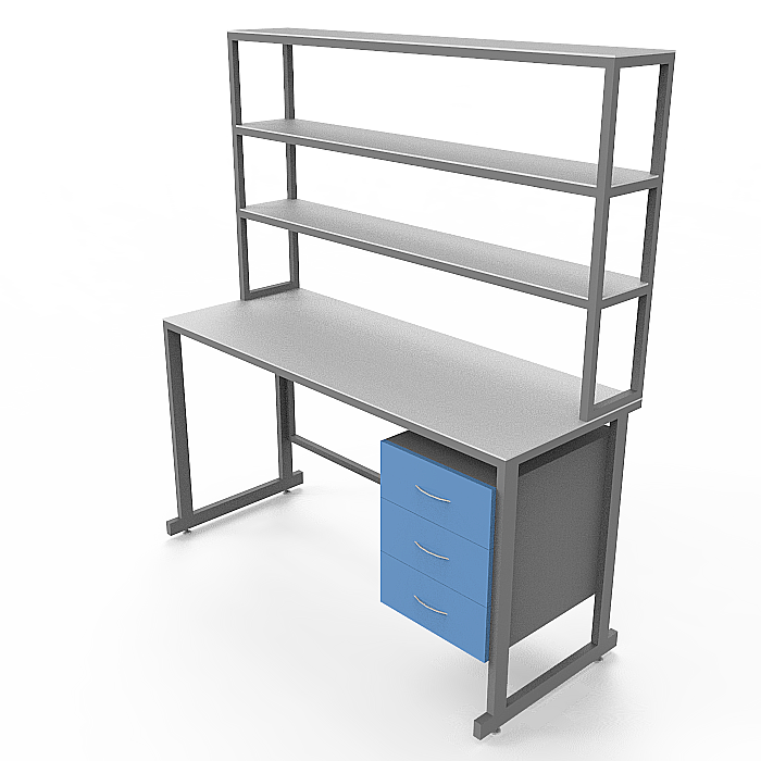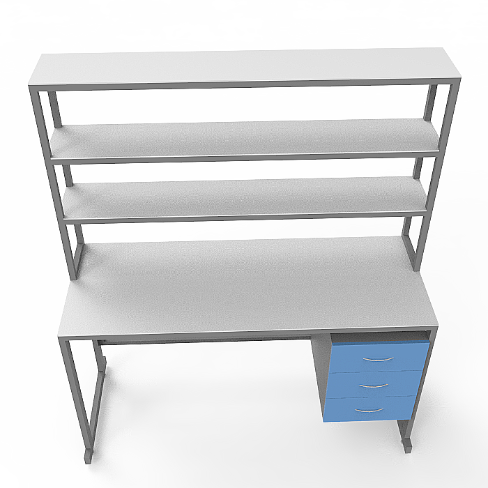Особенности модели СЛк 21.015 включают в себя надстройку с тремя полками, двумя тумбами под столешницей с по три ящика в каждой, а также регулируемые по высоте ножки с винтовыми опор-регуляторами. Стол оборудован столешницей из керамогранита, которая устойчива к химическим веществам, перепадам температуры и ударам. Каркас стола выполнен из стального профиля, защищенного порошковой краской, что придает конструкции прочность и долговечность.