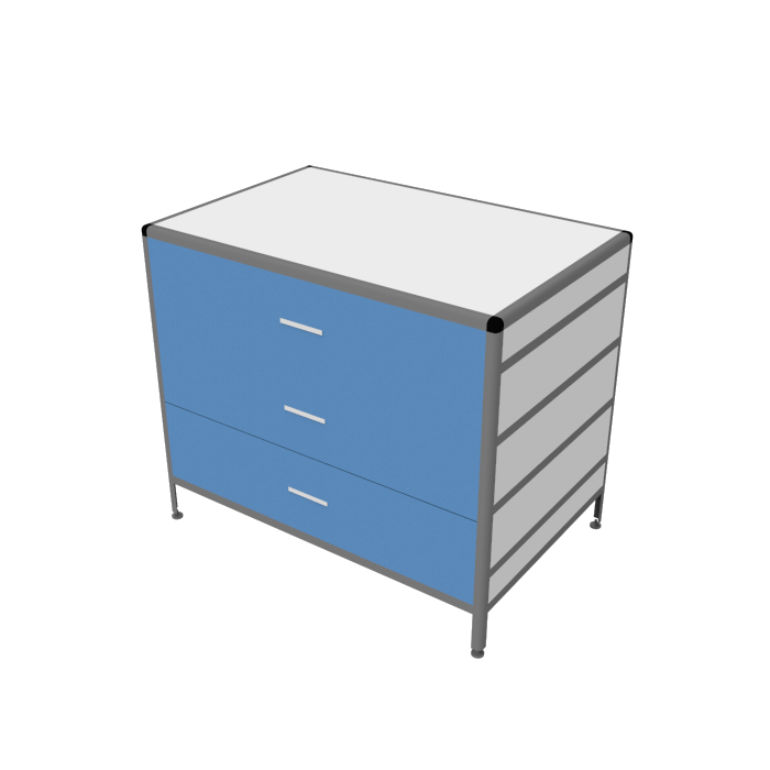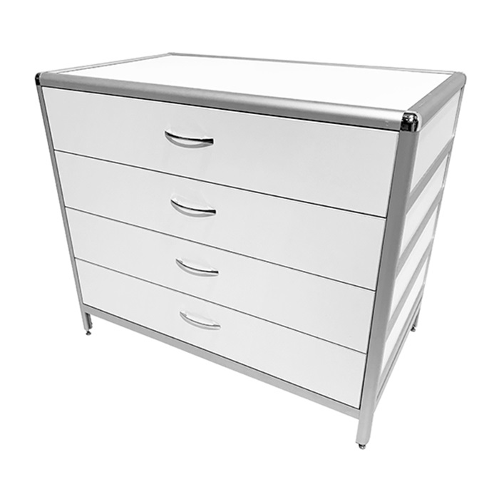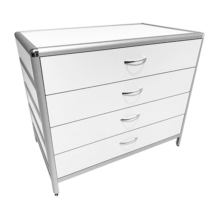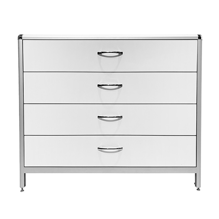 Стол-тумба MED 12.007al оснащена четырьмя выдвижными ящиками с внутренним размером 434х70х895 мм, способными выдерживать равномерно распределенную нагрузку до 10 кг на каждый ящик. Регулируемые винтовые опоры-регуляторы на ножках позволяют компенсировать неровности напольного покрытия и обеспечивают устойчивость и удобство использования стола.
