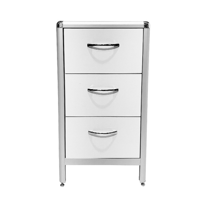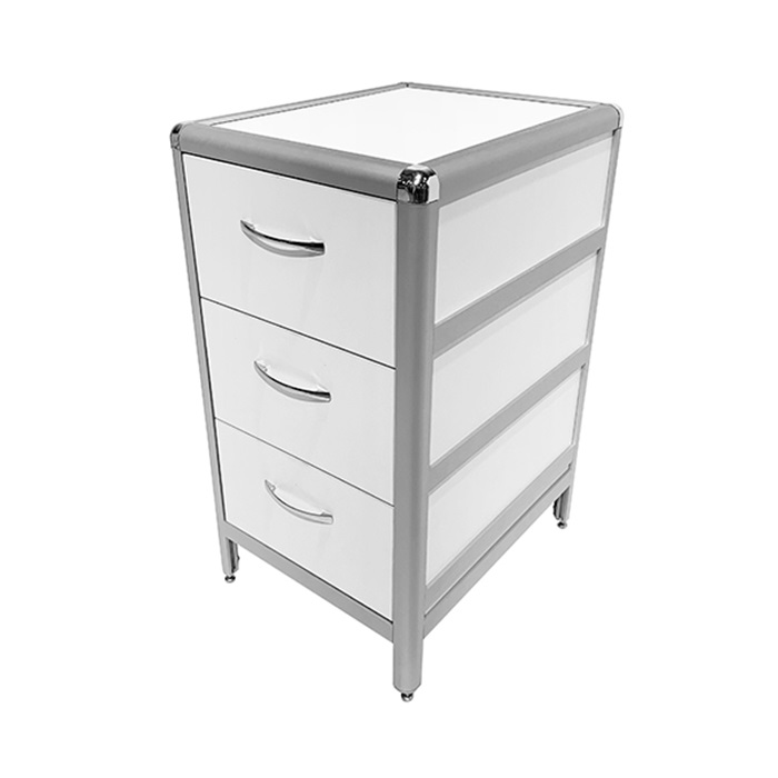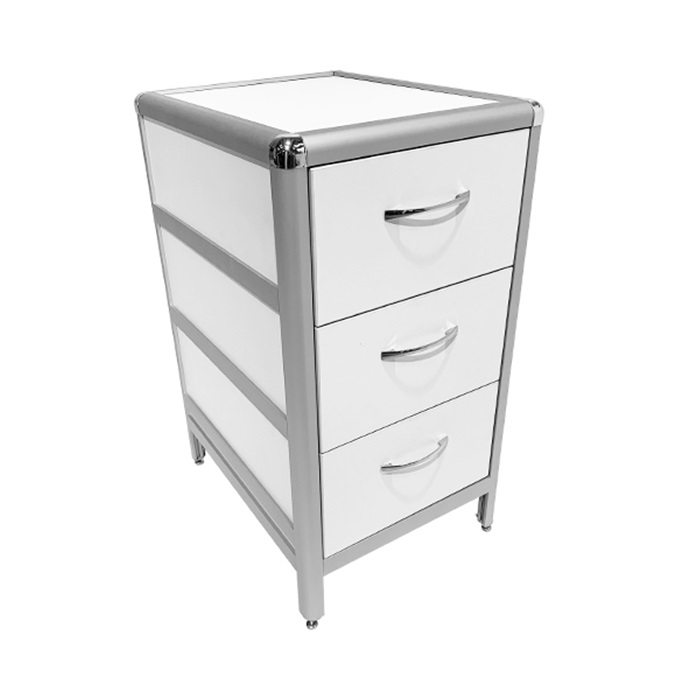 Каркас тумбы MED 16.003al изготовлен из прочного алюминиевого профиля с различными размерами, включая вертикальные стойки 30х30 мм и горизонтальные прогоны 33х20 мм, что обеспечивает прочность и долговечность конструкции. Отделка в белом цвете ЛДСП с светло-серой кромкой придает тумбе современный и стильный внешний вид.