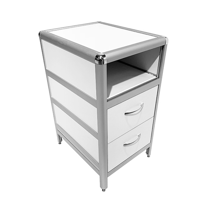 Каркас тумбы MED 16.007al выполнен из прочного алюминиевого профиля с вертикальными стойками 30х30 мм и горизонтальными прогонами 33х20 мм, обеспечивая надежность и долговечность конструкции. Отделка в белом цвете ЛДСП с кромкой светло-серого оттенка придает тумбе элегантный и современный вид.