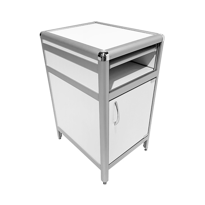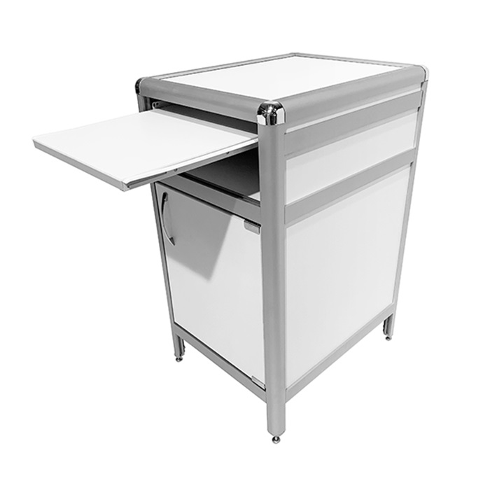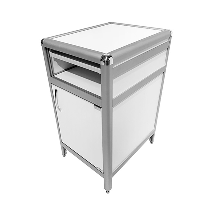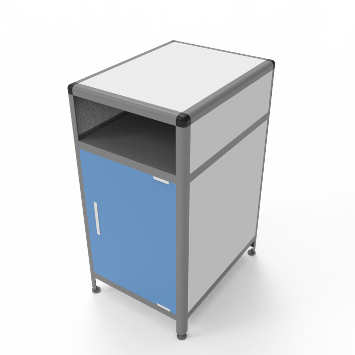 Каркас тумбы выполнен из прочного алюминиевого профиля с вертикальными стойками размером 30х30 мм и горизонтальными прогонами 33х20 мм, обеспечивая стабильность и надежность конструкции. Белое ЛДСП с кромкой светло-серого оттенка придает тумбе стильный и современный внешний вид.