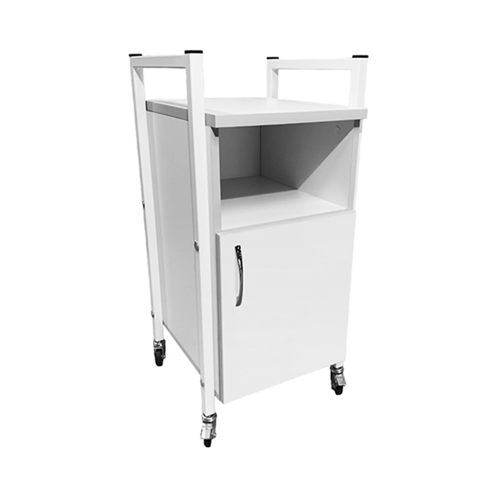 Каркас тумбы выполнен из стального металлокаркаса, покрытого порошковой краской белого цвета, что обеспечивает прочность и долговечность конструкции. Для производства тумбы используется ЛДСП толщиной 16 мм, а столешница выполнена из ЛДСП толщиной 22 мм, обеспечивая устойчивость к повреждениям и легкость в уходе. Внутри тумбы есть ниша и отдел с дверкой, что позволяет удобно хранить медицинские принадлежности и другие необходимые предметы.